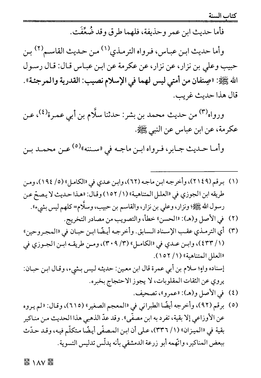 (¬١) برقم (٢١٤٩)، وأخرجه ابن ماجه (٦٢)، وابن عدي في «الكامل» (٥/ ١٩٤)، ومن طريقه ابن الجوزي في «العلل المتناهية» (١/ ١٥٢) وقال: «هذا حديث لا يصحّ عن رسول الله - صلى الله عليه وسلم -؛ ونزار، وعلي بن نزار، والقاسم بن حبيب، وسلَّام= كلهم ليس بشيء».