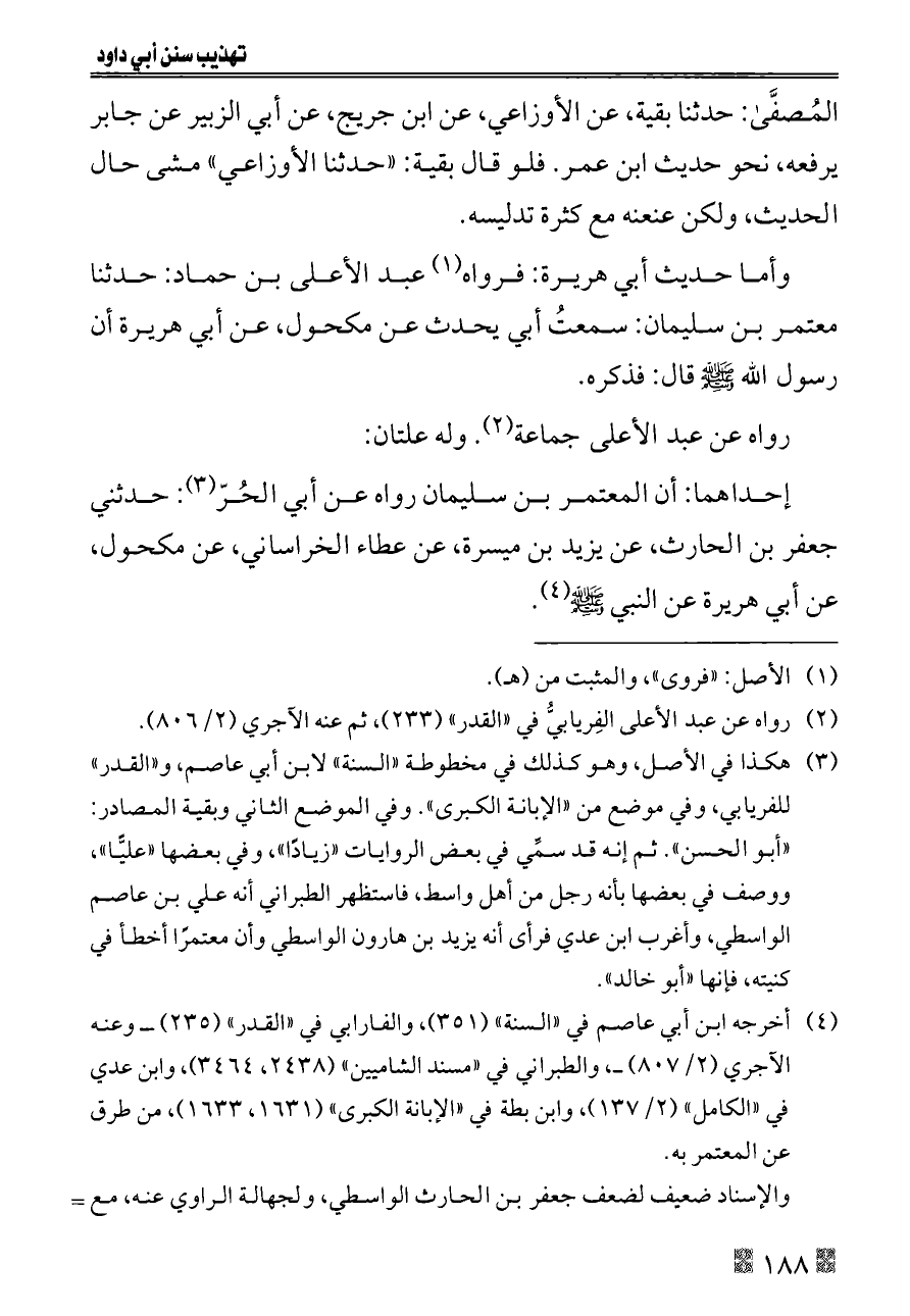 (¬٣) هكذا في الأصل، وهو كذلك في مخطوطة «السنة» لابن أبي عاصم، و «القدر» للفريابي، وفي موضع من «الإبانة الكبرى». وفي الموضع الثاني وبقية المصادر: «أبو الحسن». ثم إنه قد سمِّي في بعض الروايات «زيادًا»، وفي بعضها «عليًّا»، ووصف في بعضها بأنه رجل من أهل واسط، فاستظهر الطبراني أنه علي بن عاصم الواسطي، وأغرب ابن عدي فرأى أنه يزيد بن هارون الواسطي وأن معتمرًا أخطأ في كنيته، فإنها «أبو خالد».