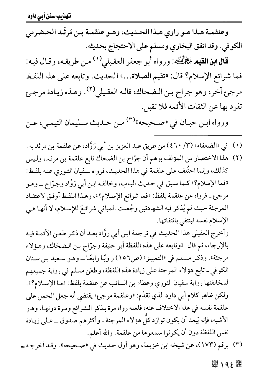 وأخرج العقيلي هذا الحديث في ترجمة ابن أبي روَّاد بعد أن ذكر طعن الأئمة فيه بالإرجاء، ثم قال: «وتابعه على هذه اللفظة أبو حنيفة وجرّاح بن الضحّاك، وهؤلاء مرجئة». وذكر مسلم في «التمييز» (ص ١٥٦) راويًا رابعًا ــ وهو سعيد بن سنان الكوفي ــ تابع هؤلاء المرجئة على زيادة هذه اللفظة، وطعَن مسلم في رواية جميعهم لمخالفتها رواية سفيان الثوري وعطاء بن السائب عن علقمة بلفظ: «ما الإسلام؟». ولكن ظاهر كلام أبي داود الذي تقدّم: «وعلقمة مرجئ» يقتضي أنه جعل الحمل على علقمة نفسه في هذا الاختلاف عنه، فلعله رواه مرة بذكر الشرائع ومرة دونها، وهو الأشبه، فإنه يَبعد أن يكون توارَد كلُّ هؤلاء المرجئة ــ وأكثرهم صدوق ــ على زيادة نفس اللفظة دون أن يكونوا سمعوها من علقمة. والله أعلم.