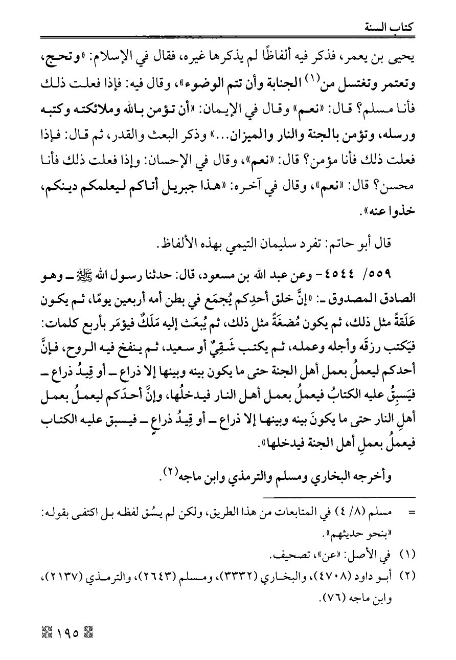 ٥٥٩/ ٤٥٤٤ - وعن عبد الله بن مسعود، قال: حدثنا رسول الله - صلى الله عليه وسلم - ــ وهو الصادق المصدوق ــ: «إنَّ خلق أحدِكم يُجمَع في بطن أمه أربعين يومًا، ثم يكون عَلَقةً مثل ذلك، ثم يكون مُضغَةً مثل ذلك، ثم يُبعَث إليه مَلَكٌ فيؤمَر بأربع كلمات: فيَكتب رزقَه وأجله وعمله، ثم يكتب شَقِيٌ أو سعيد، ثم ينفخ فيه الروح، فإنَّ أحدكم ليعملُ بعمل أهل الجنة حتى ما يكون بينه وبينها إلا ذراع ــ أو قِيدُ ذراع ــ فيَسبِقُ عليه الكتابُ فيعملُ بعمل أهل النار فيدخلُها، وإنَّ أحدَكم ليعملُ بعمل أهلِ النار حتى ما يكونَ بينه وبينها إلا ذراع ــ أو قِيدُ ذراعٍ ــ فيسبق عليه الكتاب فيعملُ بعملِ أهل الجنة فيدخلها».
