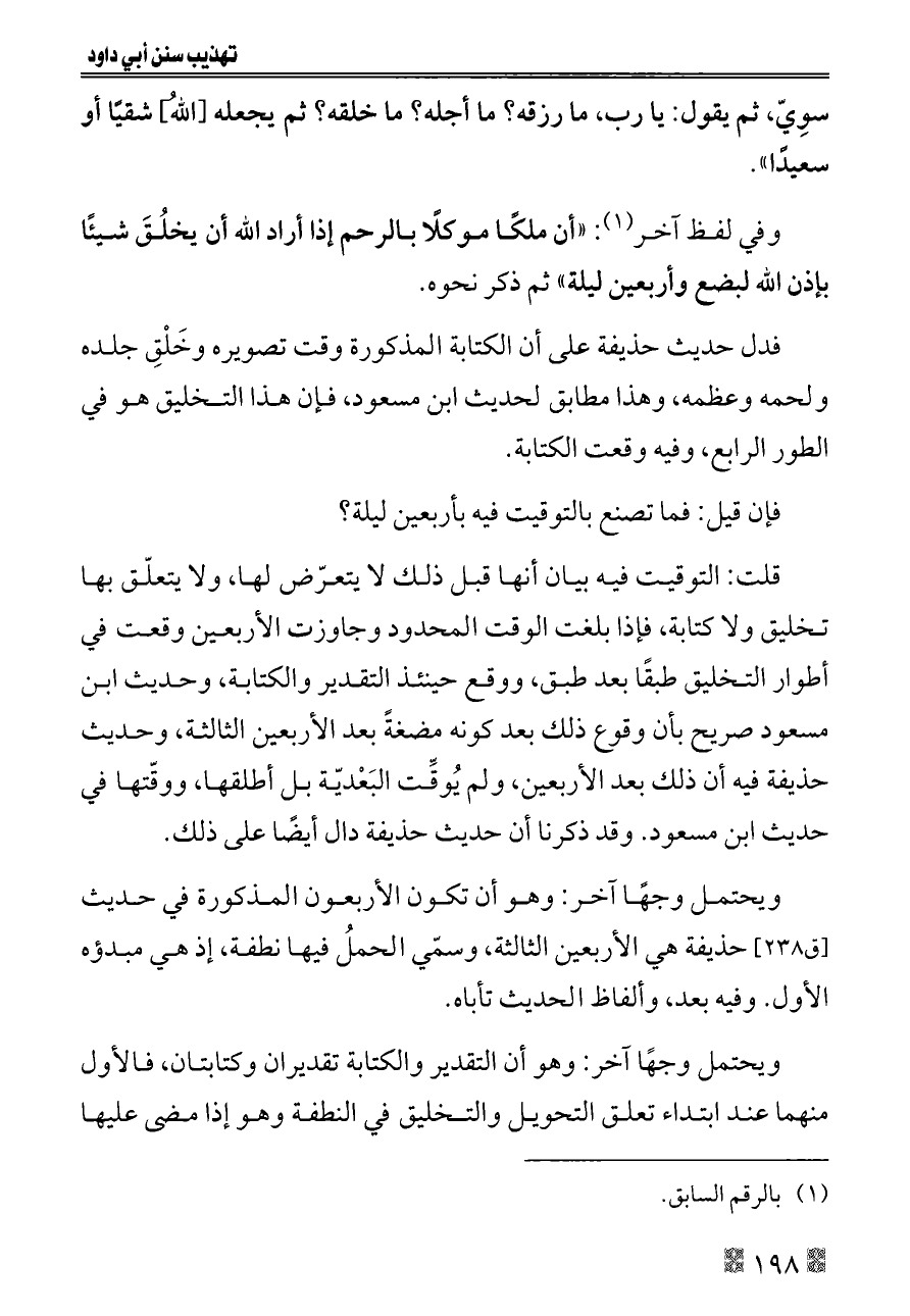 ويحتمل وجهًا آخر: وهو أن تكون الأربعون المذكورة في حديث [ق ٢٣٨] حذيفة هي الأربعين الثالثة، وسمّي الحملُ فيها نطفة، إذ هي مبدؤه الأول. وفيه بعد، وألفاظ الحديث تأباه.