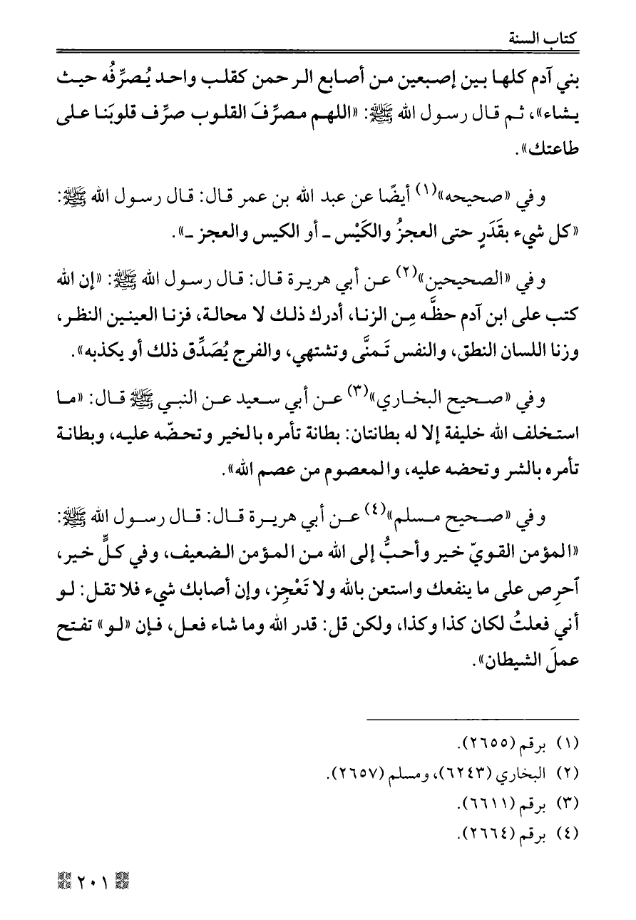 بني آدم كلها بين إصبعين من أصابع الرحمن كقلب واحد يُصرِّفُه حيث يشاء»، ثم قال رسول الله - صلى الله عليه وسلم -: «اللهم مصرِّفَ القلوب صرِّف قلوبَنا على طاعتك».