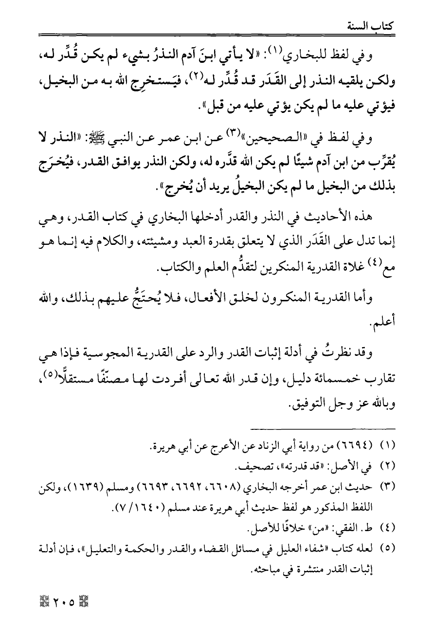 هذه الأحاديث في النذر والقدر أدخلها البخاري في كتاب القدر، وهي إنما تدل على القَدَر الذي لا يتعلق بقدرة العبد ومشيئته، والكلام فيه إنما هو مع (¬٤) غلاة القدرية المنكرين لتقدُّم العلم والكتاب.