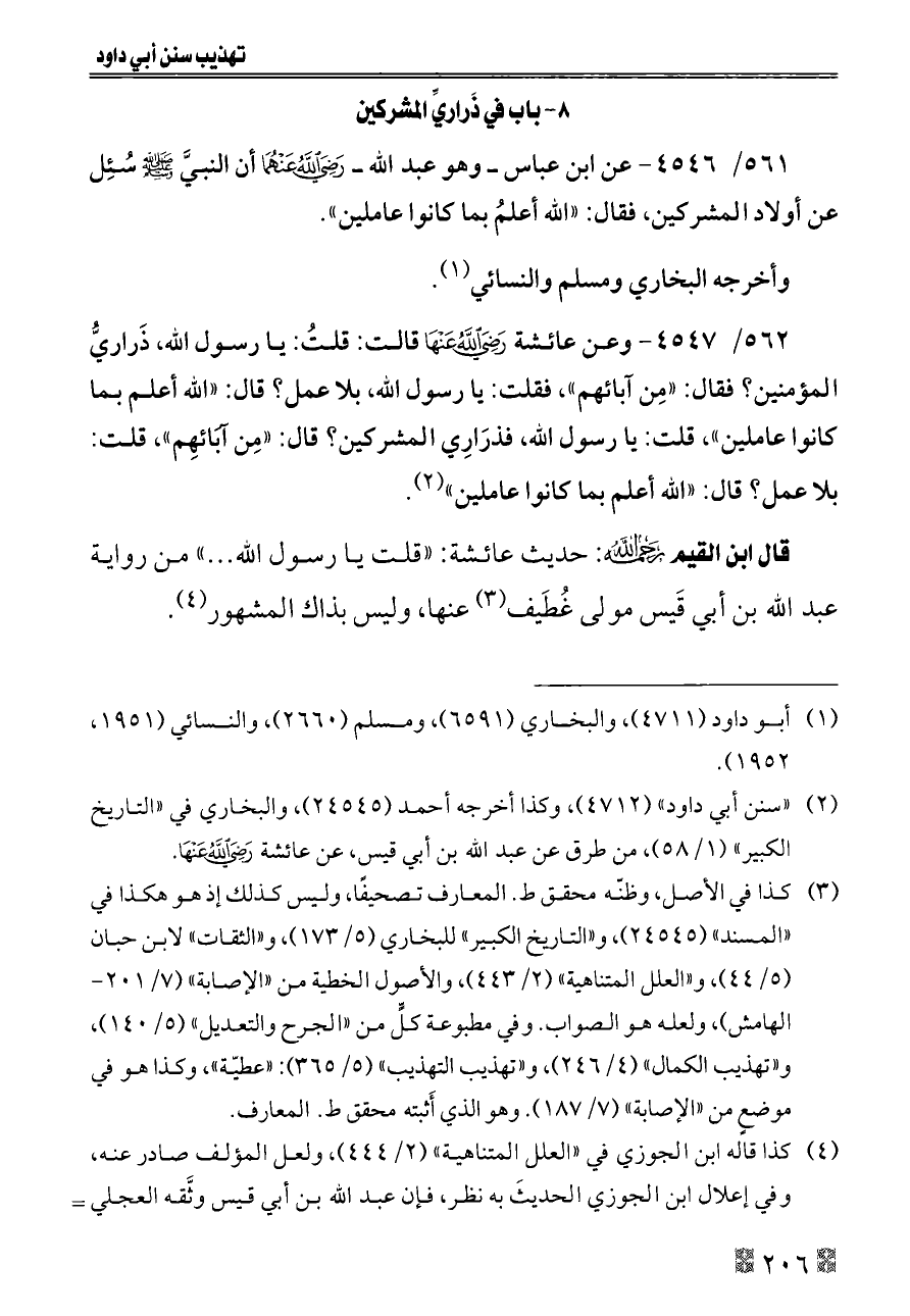 ٥٦١/ ٤٥٤٦ - عن ابن عباس ــ وهو عبد الله ــ - رضي الله عنهما - أن النبيَّ - صلى الله عليه وسلم - سُئِل عن أولاد المشركين، فقال: «الله أعلمُ بما كانوا عاملين».
