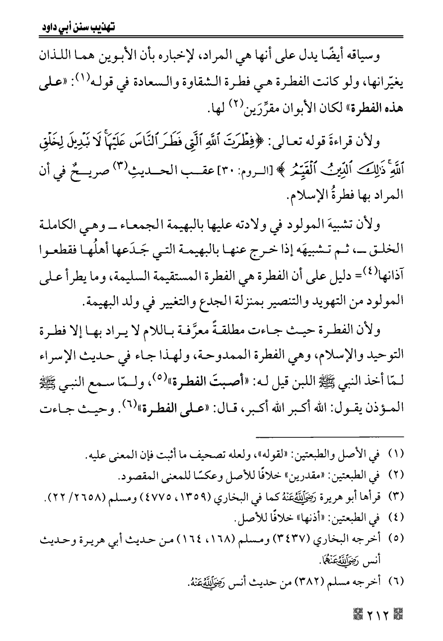 ولأن تشبيهَ المولود في ولادته عليها بالبهيمة الجمعاء ــ وهي الكاملة الخلق ــ، ثم تشبيهَه إذا خرج عنها بالبهيمة التي جَدَعها أهلُها فقطعوا آذانها (¬٤) = دليل على أن الفطرة هي الفطرة المستقيمة السليمة، وما يطرأ على المولود من التهويد والتنصير بمنزلة الجدع والتغيير في ولد البهيمة.