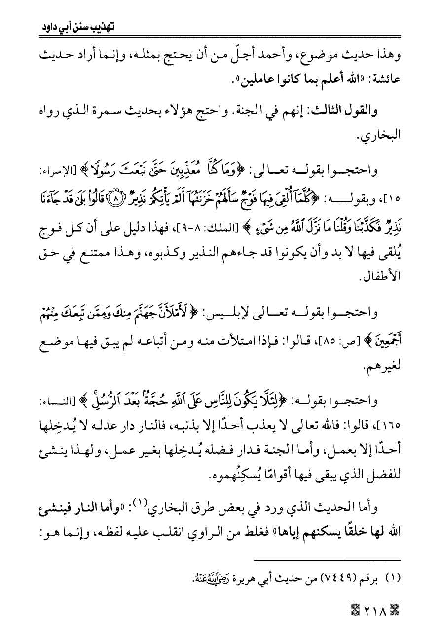 واحتجوا بقوله تعالى: {وَمَا كُنَّا مُعَذِّبِينَ حَتَّى نَبْعَثَ رَسُولًا} [الإسراء: ١٥]، وبقوله: {كُلَّمَا أُلْقِيَ فِيهَا فَوْجٌ سَأَلَهُمْ خَزَنَتُهَا أَلَمْ يَأْتِكُمْ نَذِيرٌ (٨) قَالُوا بَلَى قَدْ جَاءَنَا نَذِيرٌ فَكَذَّبْنَا وَقُلْنَا مَا نَزَّلَ اللَّهُ مِنْ شَيْءٍ} [الملك: ٨ - ٩]، فهذا دليل على أن كل فوج يُلقى فيها لا بد وأن يكونوا قد جاءهم النذير وكذبوه، وهذا ممتنع في حق الأطفال.