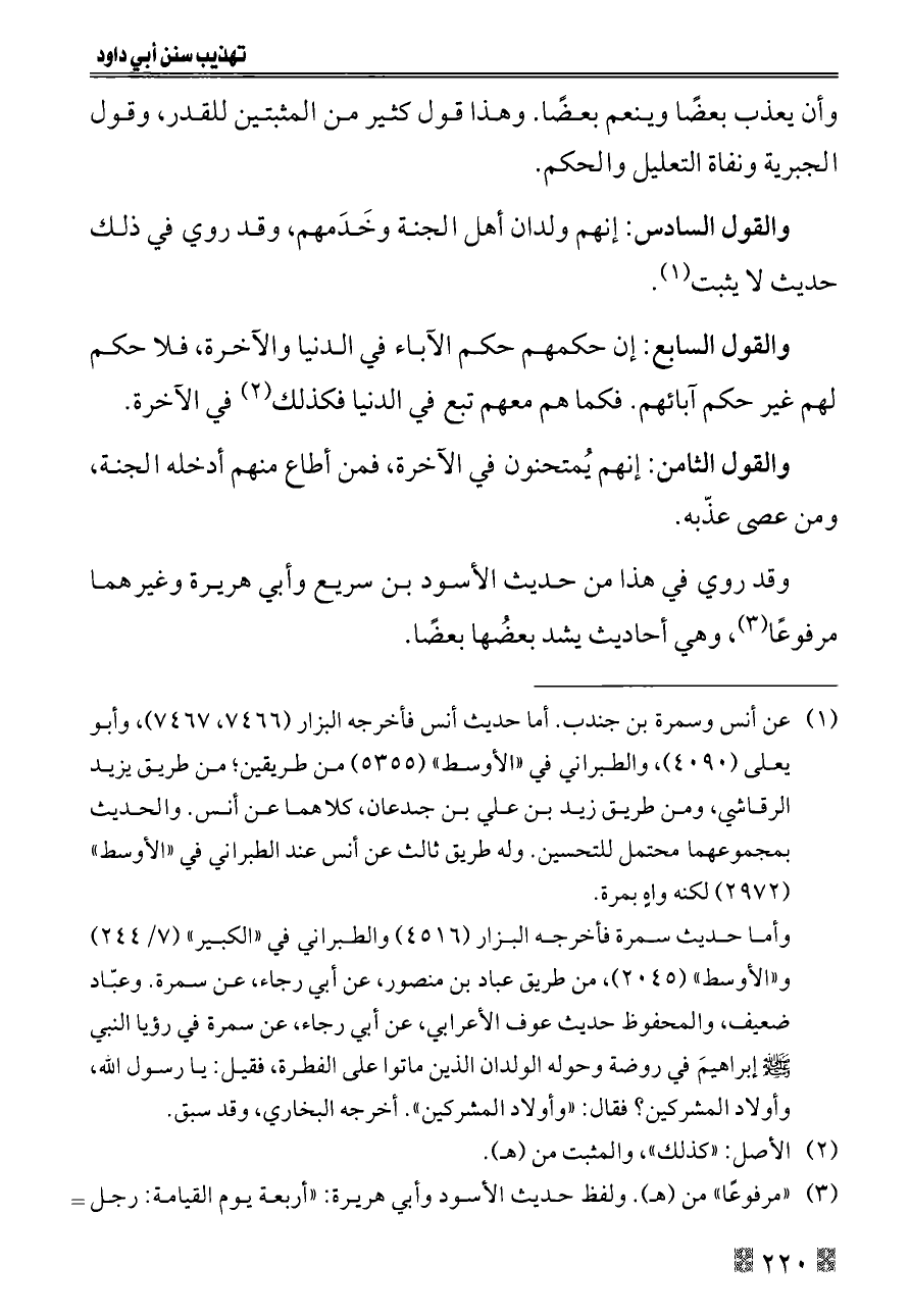 والقول السابع: إن حكمهم حكم الآباء في الدنيا والآخرة، فلا حكم لهم غير حكم آبائهم. فكما هم معهم تبع في الدنيا فكذلك (¬٢) في الآخرة.