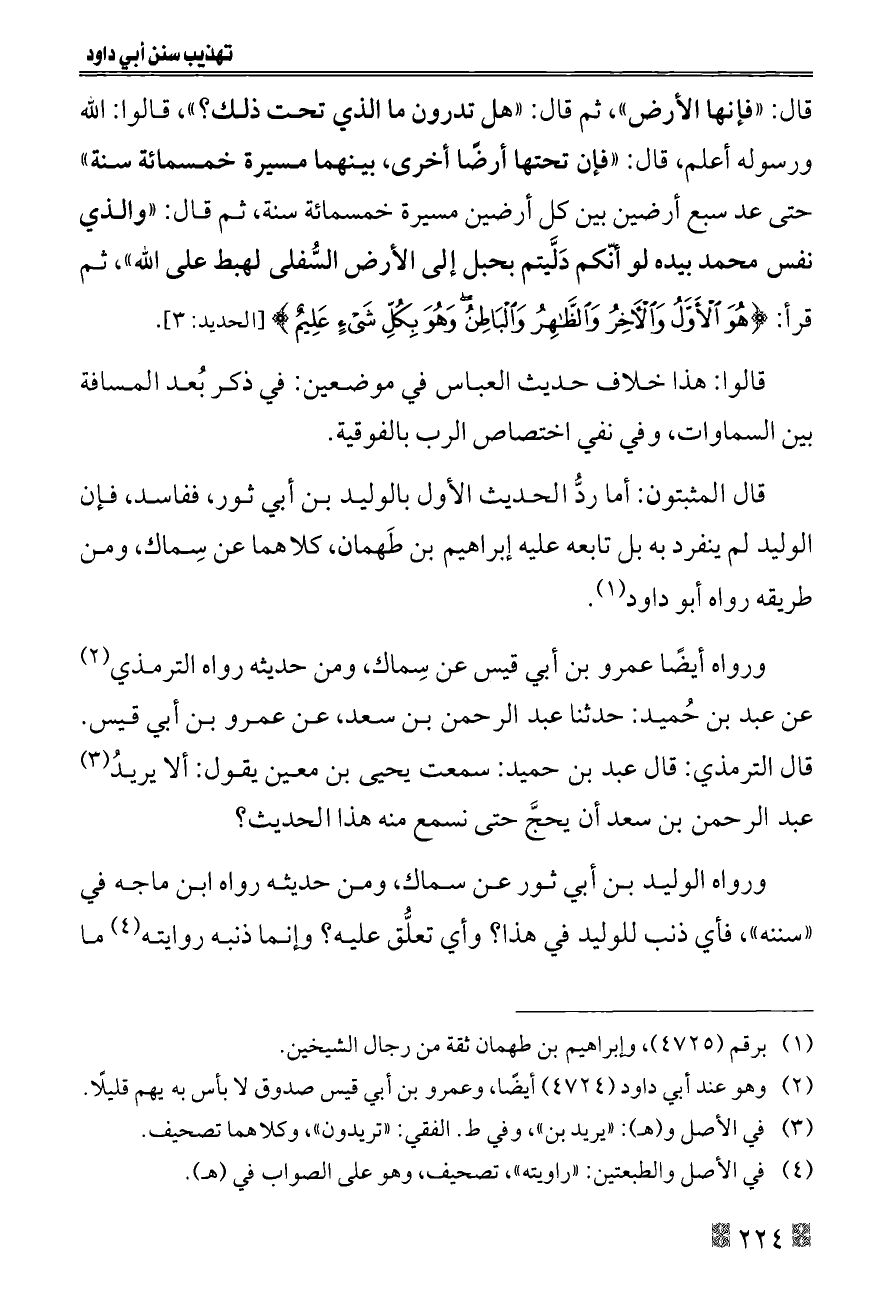 قال المثبتون: أما ردُّ الحديث الأول بالوليد بن أبي ثور، ففاسد، فإن الوليد لم ينفرد به بل تابعه عليه إبراهيم بن طَهمان، كلاهما عن سِماك، ومن طريقه رواه أبو داود (¬١).