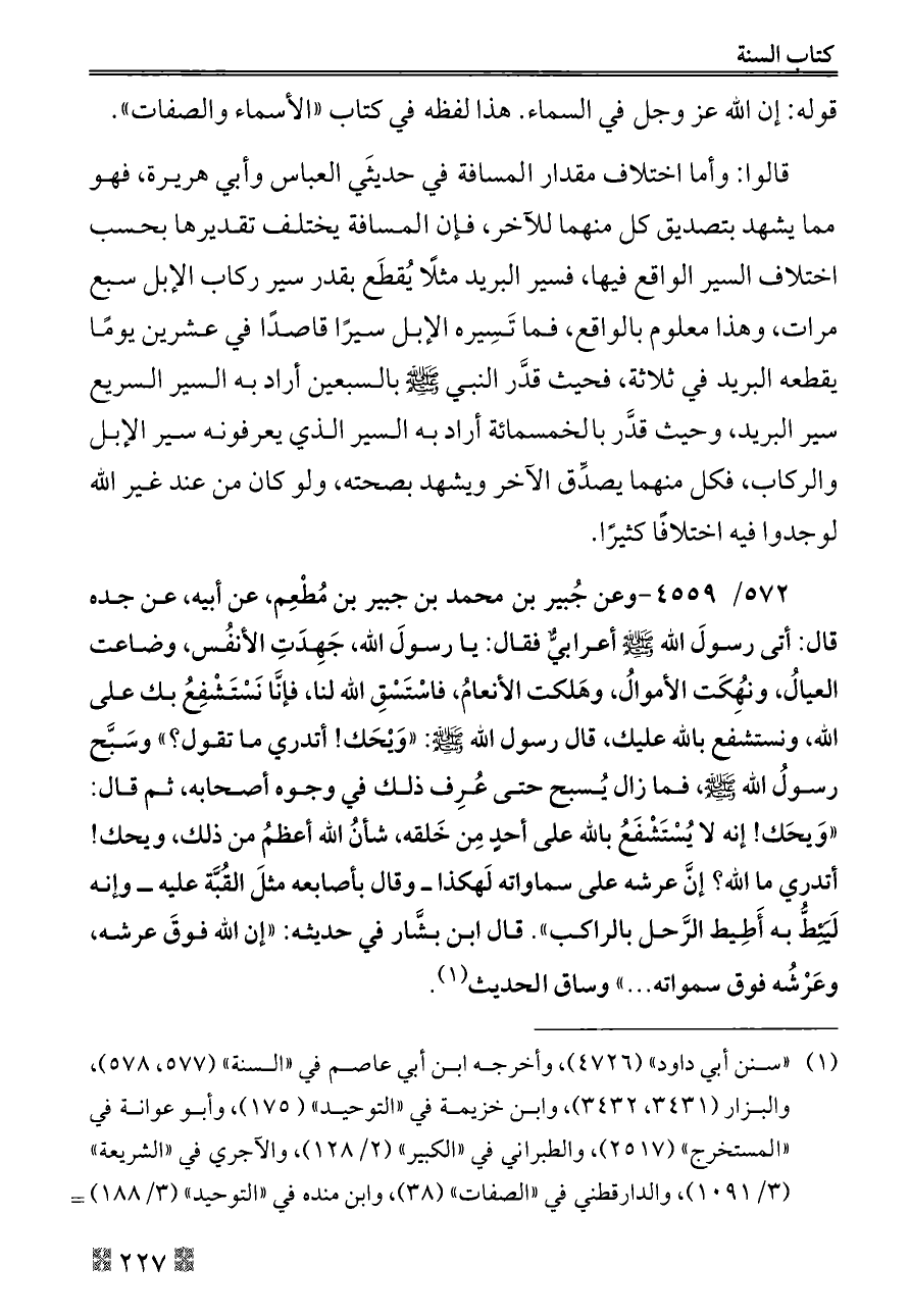 ٥٧٢/ ٤٥٥٩ - وعن جُبير بن محمد بن جبير بن مُطْعِم، عن أبيه، عن جده قال: أتى رسولَ الله - صلى الله عليه وسلم - أعرابيٌّ فقال: يا رسولَ الله، جَهِدَتِ الأنفُس، وضاعت العيالُ، ونُهِكَت الأموالُ، وهَلكت الأنعامُ، فاسْتَسْقِ الله لنا، فإنَّا نَسْتَشْفِعُ بك على الله، ونستشفع بالله عليك، قال رسول الله - صلى الله عليه وسلم -: «وَيْحَك! أتدري ما تقول؟» وسَبَّح رسولُ الله - صلى الله عليه وسلم -، فما زال يُسبح حتى عُرِف ذلك في وجوه أصحابه، ثم قال: «وَيحَك! إنه لا يُسْتَشْفَعُ بالله على أحدٍ مِن خَلقه، شأنُ الله أعظمُ من ذلك، ويحك! أتدري ما الله؟ إنَّ عرشه على سماواته لَهكذا ــ وقال بأصابعه مثلَ القُبَّة عليه ــ وإنه لَيَئِطُّ به أَطِيط الرَّحل بالراكب». قال ابن بشَّار في حديثه: «إن الله فوقَ عرشه، وعَرْشُه فوق سمواته ... » وساق الحديث (¬١).