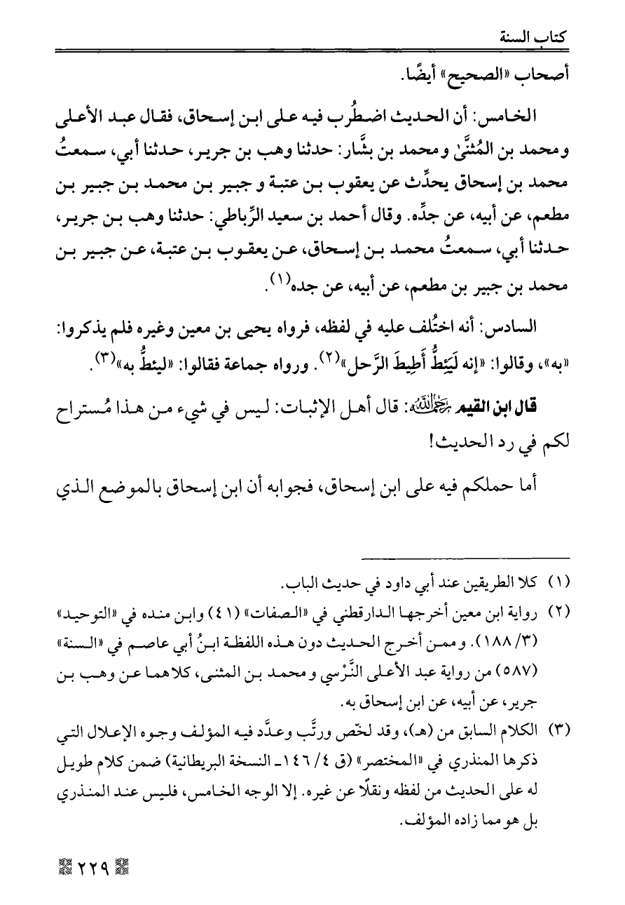 الخامس: أن الحديث اضطُرب فيه على ابن إسحاق، فقال عبد الأعلى ومحمد بن المُثنَّى ومحمد بن بشَّار: حدثنا وهب بن جرير، حدثنا أبي، سمعتُ محمد بن إسحاق يحدِّث عن يعقوب بن عتبة و جبير بن محمد بن جبير بن مطعم، عن أبيه، عن جدِّه. وقال أحمد بن سعيد الرِّباطي: حدثنا وهب بن جرير، حدثنا أبي، سمعتُ محمد بن إسحاق، عن يعقوب بن عتبة، عن جبير بن محمد بن جبير بن مطعم، عن أبيه، عن جده (¬١).