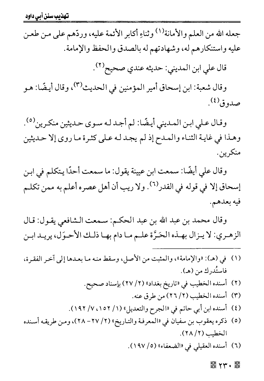 وقال علي أيضًا: سمعت ابن عيينة يقول: ما سمعت أحدًا يتكلم في ابن إسحاق إلا في قوله في القدر (¬٦). ولا ريب أن أهل عصره أعلم به ممن تكلم فيه بعدهم.