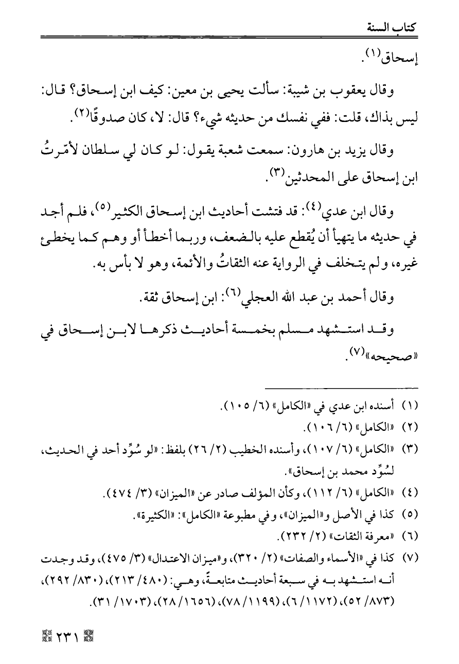 (¬٣) «الكامل» (٦/ ١٠٧)، وأسنده الخطيب (٢/ ٢٦) بلفظ: «لو سُوِّد أحد في الحديث، لسُوِّد محمد بن إسحاق».