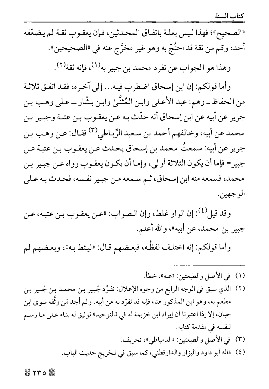 وأما قولكم: إن ابن إسحاق اضطرب فيه ... إلى آخره، فقد اتفق ثلاثة من الحفاظ ــ وهم: عبد الأعلى وابن المُثنَّى وابن بشّار ــ على وهب بن جرير عن أبيه عن ابن إسحاق أنه حدّث به عن يعقوب بن عتبة وجبير بن محمد عن أبيه، وخالفهم أحمد بن سعيد الرِّباطي (¬٣) فقال: عن وهب بن جرير عن أبيه: سمعتُ محمد بن إسحاق يحدث عن يعقوب بن عتبة عن جبير= فإما أن يكون الثلاثة أولى، وإما أن يكون يعقوب رواه عن جبير بن محمد، فسمعه منه ابن إسحاق، ثم سمعه من جبير نفسه، فحدث به على الوجهين.