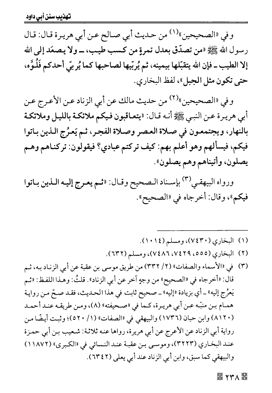 (¬٣) في «الأسماء والصفات» (٢/ ٣٣٢) من طريق موسى بن عقبة عن أبي الزناد به، ثم قال: «أخرجاه في «الصحيح» من وجهٍ آخر عن أبي الزناد». قلتُ: وهذا اللفظ: «ثم يَعرُج إليه» ــ أي بزيادة «إليه» ــ صحيح ثابت في هذا الحديث، فقد صحّ من رواية همام بن منبّه عن أبي هريرة، كما في «صحيفته» (٨)، ومن طريقه عند أحمد (٨١٢٠) وابن حبان (١٧٣٦) والبيهقي في «الصفات» (١/ ٥٢٠)؛ وثبت أيضًا من رواية أبي الزناد عن الأعرج عن أبي هريرة، رواها عنه ثلاثة: شعيب بن أبي حمزة عند البخاري (٣٢٢٣)، وموسى بن عقبة عند النسائي في «الكبرى» (١١٨٧٢) والبيهقي كما سبق، وابن أبي الزناد عند أبي يعلى (٦٣٤٢).