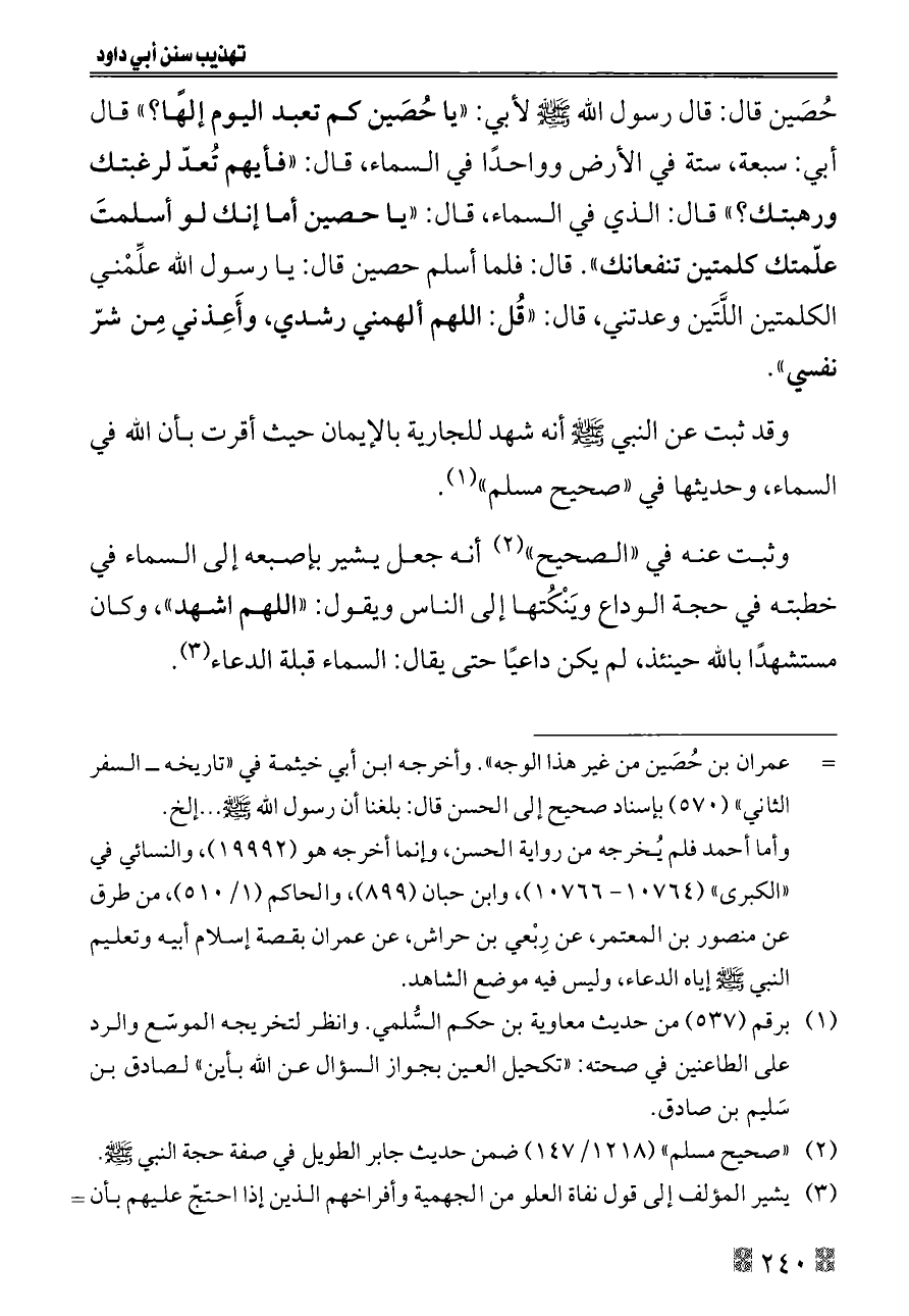 (¬١) برقم (٥٣٧) من حديث معاوية بن حكم السُّلمي. وانظر لتخريجه الموسّع والرد على الطاعنين في صحته: «تكحيل العين بجواز السؤال عن الله بأين» لصادق بن سَليم بن صادق.