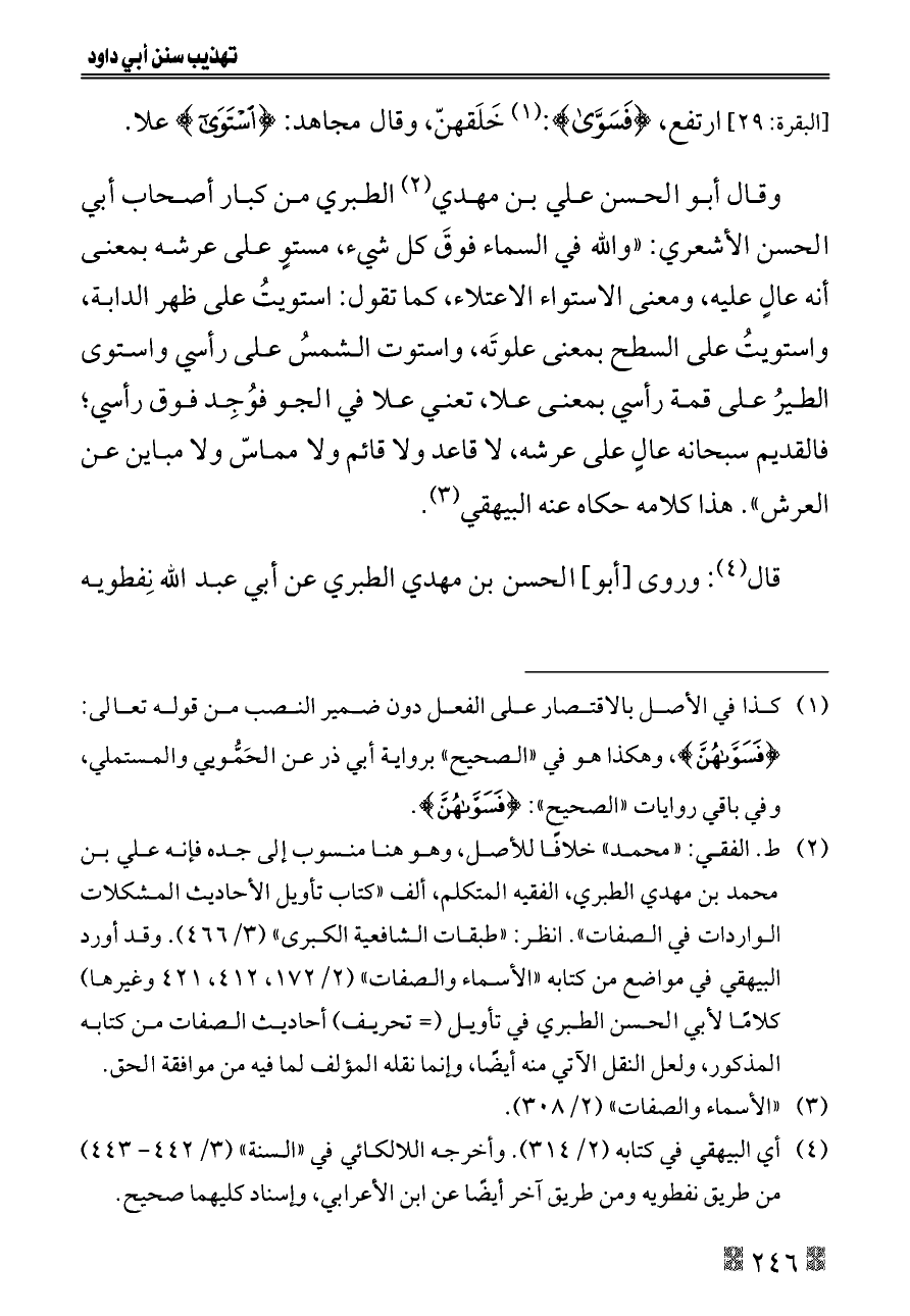(¬٢) ط. الفقي: «محمد» خلافًا للأصل، وهو هنا منسوب إلى جده فإنه علي بن محمد بن مهدي الطبري، الفقيه المتكلم، ألف «كتاب تأويل الأحاديث المشكلات الواردات في الصفات». انظر: «طبقات الشافعية الكبرى» (٣/ ٤٦٦). وقد أورد البيهقي في مواضع من كتابه «الأسماء والصفات» (٢/ ١٧٢، ٤١٢، ٤٢١ وغيرها) كلامًا لأبي الحسن الطبري في تأويل (= تحريف) أحاديث الصفات من كتابه المذكور، ولعل النقل الآتي منه أيضًا، وإنما نقله المؤلف لما فيه من موافقة الحق.