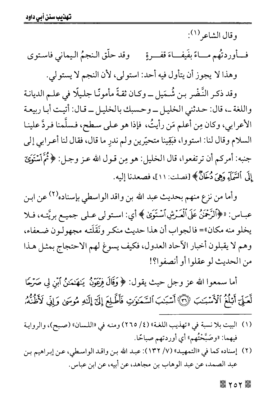 وقد ذكر النَّضْر بن شُمَيل ــ وكان ثقةً مأمونًا جليلًا في علم الديانة واللغة ــ، قال: حدثني الخليل ــ وحسبك بالخليل ــ قال: أتيت أبا ربيعة الأعرابي، وكان مِن أعلم مَن رأيتُ، فإذا هو على سطح، فسلَّمنا فردَّ علينا السلام وقال لنا: استووا، فبَقِينا متحيّرين ولم ندرِ ما قال، فقال لنا أعرابي إلى جنبه: أمركم أن ترتفعوا، قال الخليل: هو مِن قول الله عز وجل: {ثُمَّ اسْتَوَى إِلَى السَّمَاءِ وَهِيَ دُخَانٌ} [فصلت: ١١]، فصعدنا إليه.