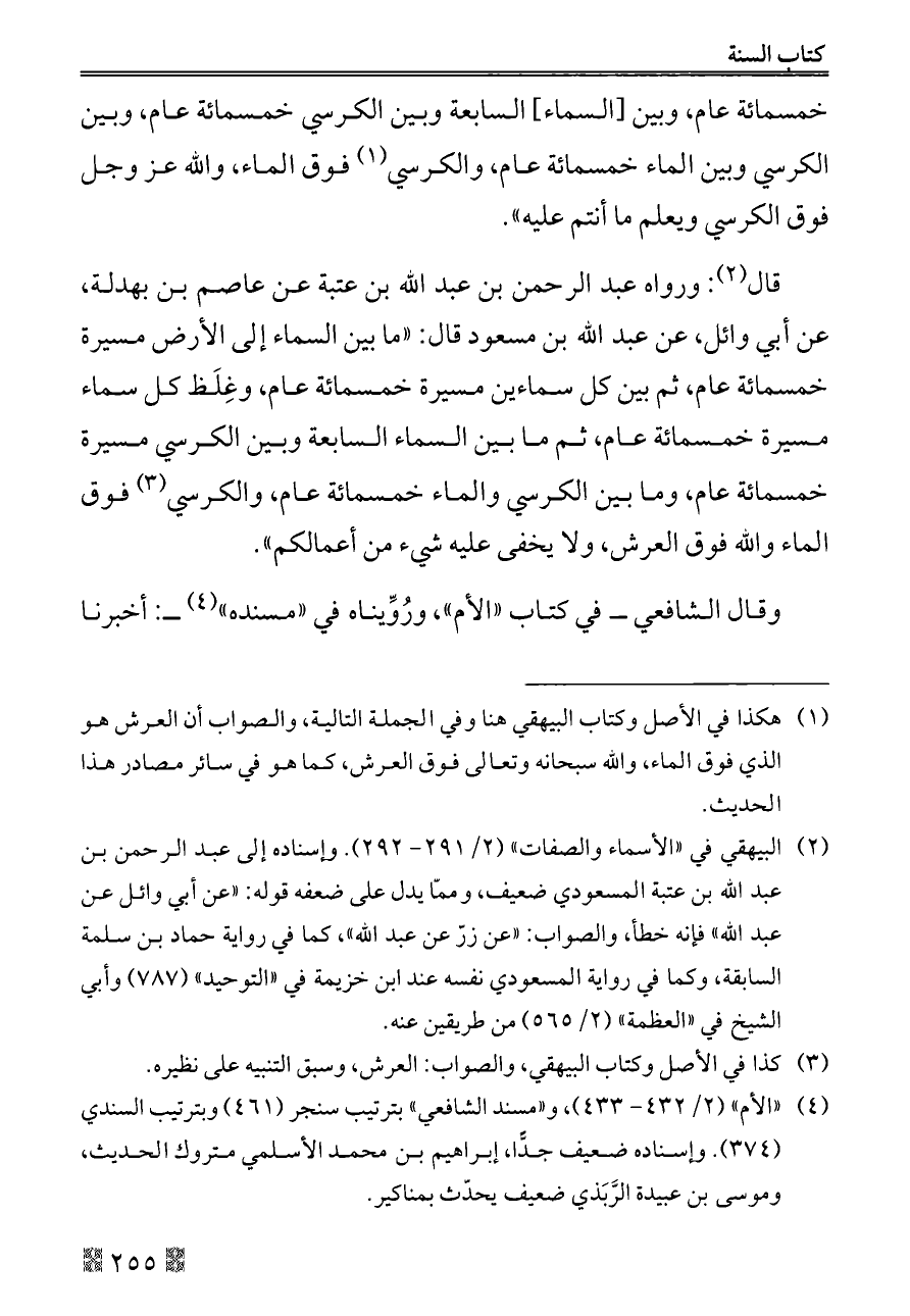 (¬٢) البيهقي في «الأسماء والصفات» (٢/ ٢٩١ - ٢٩٢). وإسناده إلى عبد الرحمن بن عبد الله بن عتبة المسعودي ضعيف، وممّا يدل على ضعفه قوله: «عن أبي وائل عن عبد الله» فإنه خطأ، والصواب: «عن زرّ عن عبد الله»، كما في رواية حماد بن سلمة السابقة، وكما في رواية المسعودي نفسه عند ابن خزيمة في «التوحيد» (٧٨٧) وأبي الشيخ في «العظمة» (٢/ ٥٦٥) من طريقين عنه.