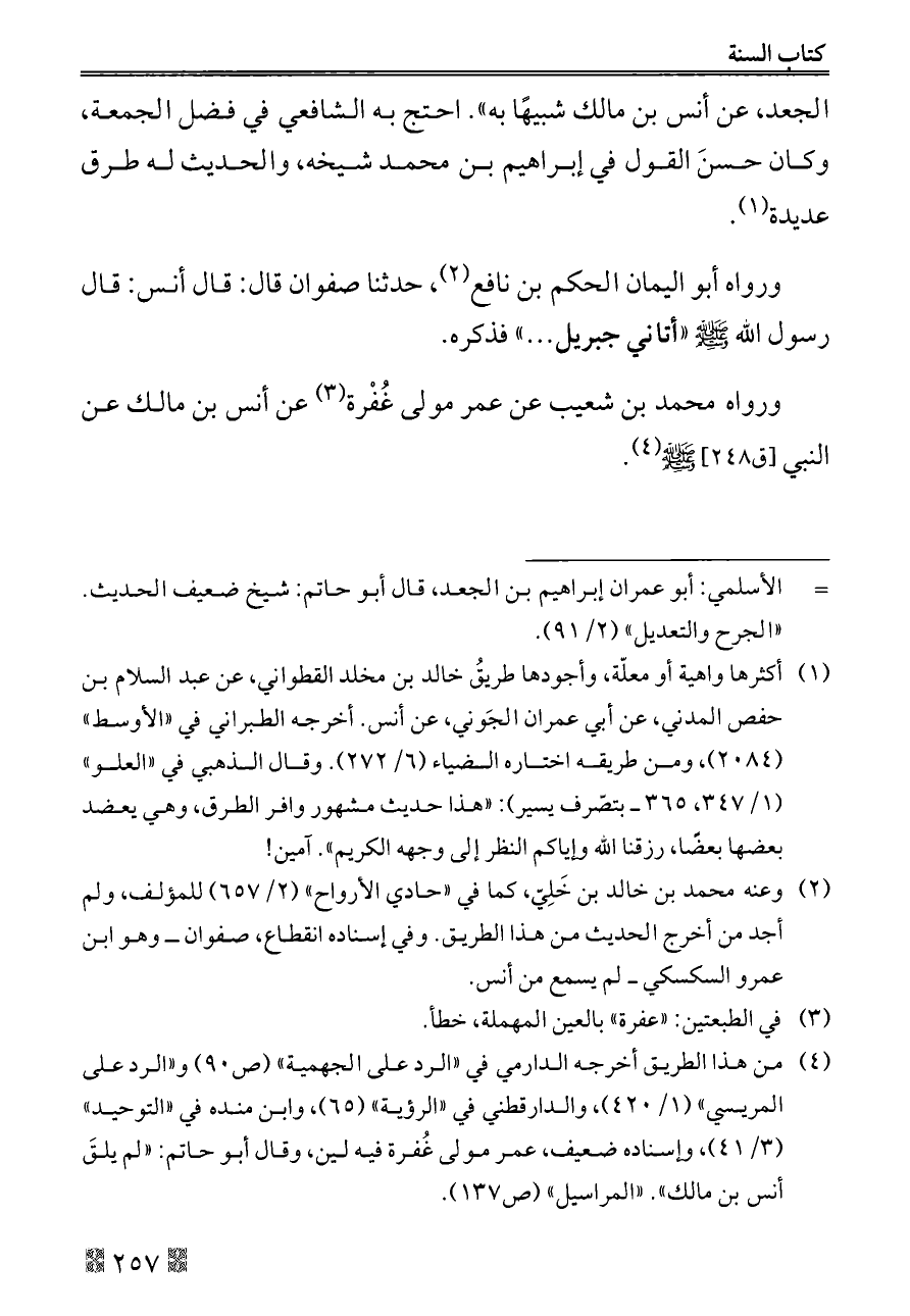 الجعد، عن أنس بن مالك شبيهًا به». احتج به الشافعي في فضل الجمعة، وكان حسنَ القول في إبراهيم بن محمد شيخه، والحديث له طرق عديدة (¬١).