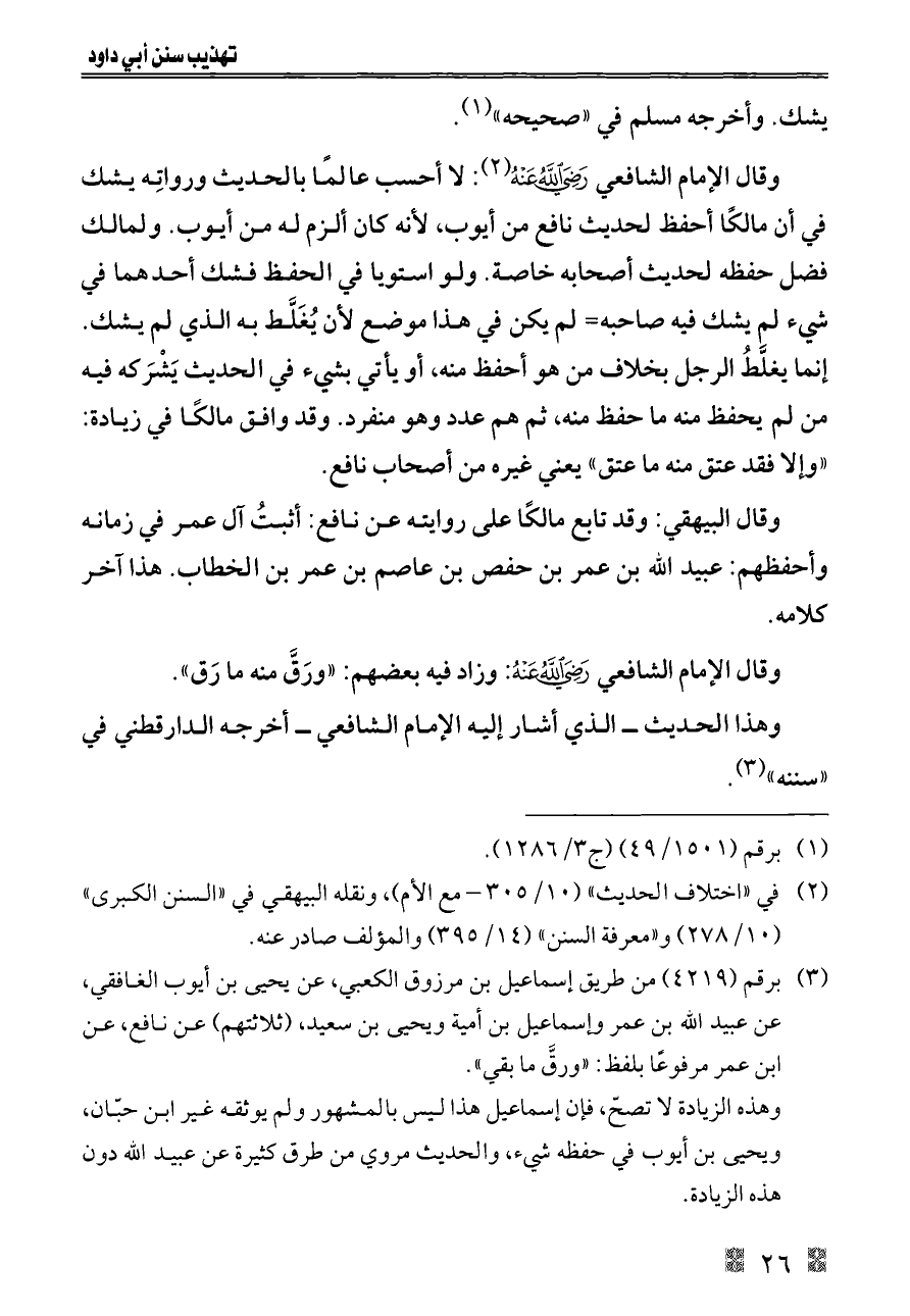 وقال الإمام الشافعي - رضي الله عنه - (¬٢): لا أحسب عالمًا بالحديث ورواتِه يشك في أن مالكًا أحفظ لحديث نافع من أيوب، لأنه كان ألزم له من أيوب. ولمالك فضل حفظه لحديث أصحابه خاصة. ولو استويا في الحفظ فشك أحدهما في شيء لم يشك فيه صاحبه= لم يكن في هذا موضع لأن يُغَلَّط به الذي لم يشك. إنما يغلَّطُ الرجل بخلاف من هو أحفظ منه، أو يأتي بشيء في الحديث يَشْرَكه فيه من لم يحفظ منه ما حفظ منه، ثم هم عدد وهو منفرد. وقد وافق مالكًا في زيادة: «وإلا فقد عتق منه ما عتق» يعني غيره من أصحاب نافع.