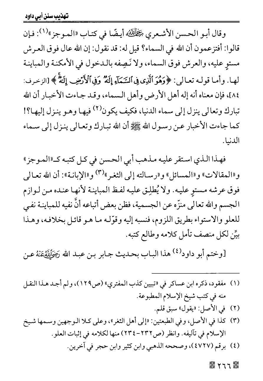 فهذا الذي استقر عليه مذهب أبي الحسن في كل كتبه كـ «الموجز» و «المقالات» و «المسائل» و «رسالته إلى الثغر» (¬٣) و «الإبانة»: أن الله تعالى فوق عرشه مستوٍ عليه. ولا يُطلِق عليه لفظ المباينة لأنها عنده من لوازم الجسم والله تعالى منزّه عن الجسمية، فظن بعض أتباعه أنَّ نفيه للمباينة نفي للعلو والاستواء بطريق اللزوم، فنسبه إليه وقوّله ما هو قائل بخلافه، وهذا بيِّن لكل منصف تأمل كلامه وطالع كتبه.