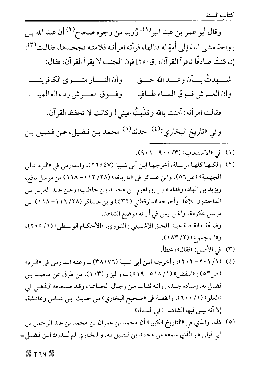 (¬٢) ولكنها كلها مرسلة، أخرجها ابن أبي شيبة (٢٦٥٤٧)، والدارمي في «الرد على الجهمية» (ص ٥٦)، وابن عساكر في «تاريخه» (٢٨/ ١١٢ - ١١٨) من مرسل نافع، ويزيد بن الهاد، وقدامة بن إبراهيم بن محمد بن حاطب، وعن عبد العزيز بن الماجشون بلاغًا. وأخرجه الدارقطني (٤٣٢) وابن عساكر (٢٨/ ١١٦ - ١١٨) من مرسل عكرمة، ولكن ليس في أبياته موضع الشاهد.