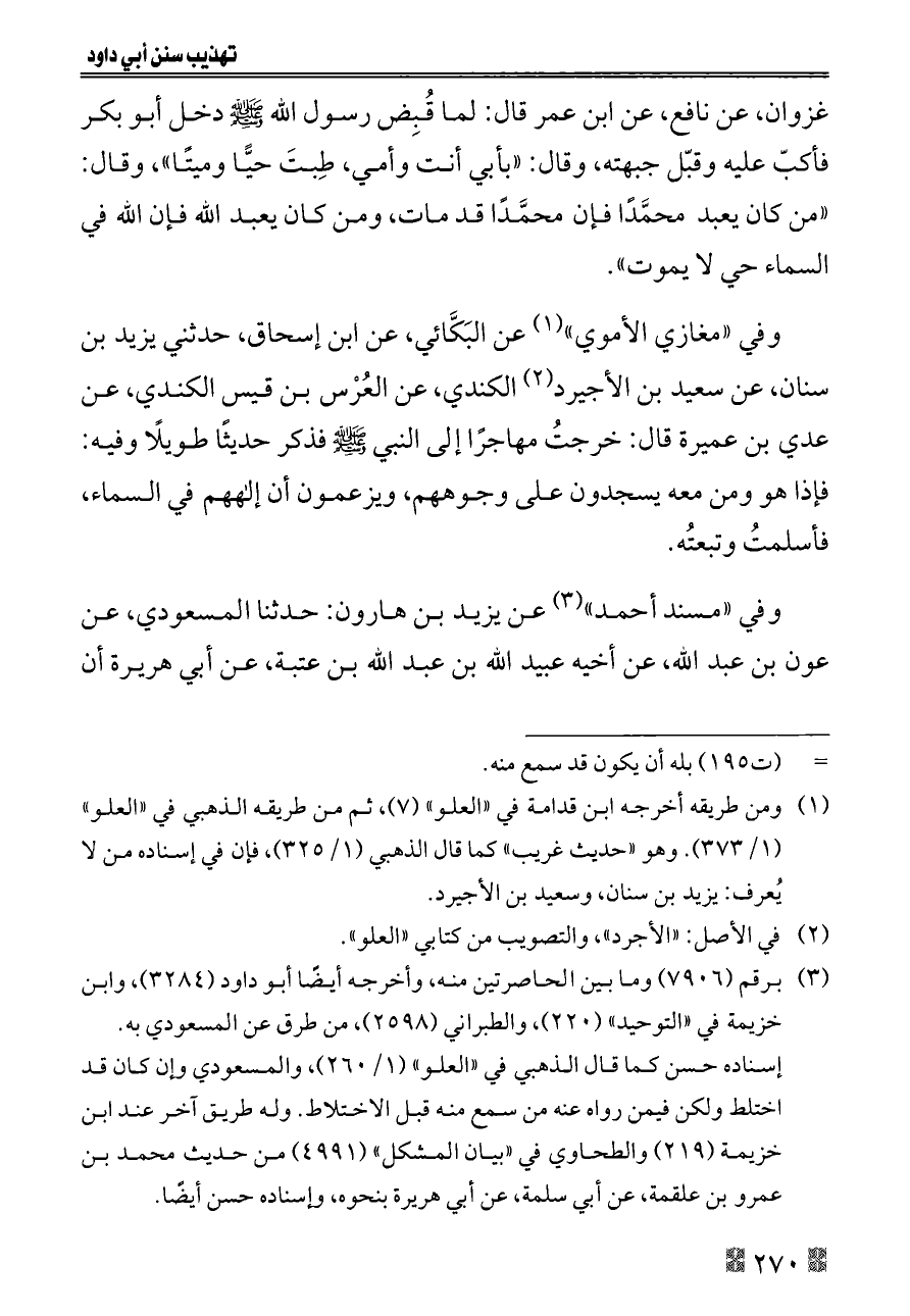 (¬١) ومن طريقه أخرجه ابن قدامة في «العلو» (٧)، ثم من طريقه الذهبي في «العلو» (١/ ٣٧٣). وهو «حديث غريب» كما قال الذهبي (١/ ٣٢٥)، فإن في إسناده من لا يُعرف: يزيد بن سنان، وسعيد بن الأجيرد.