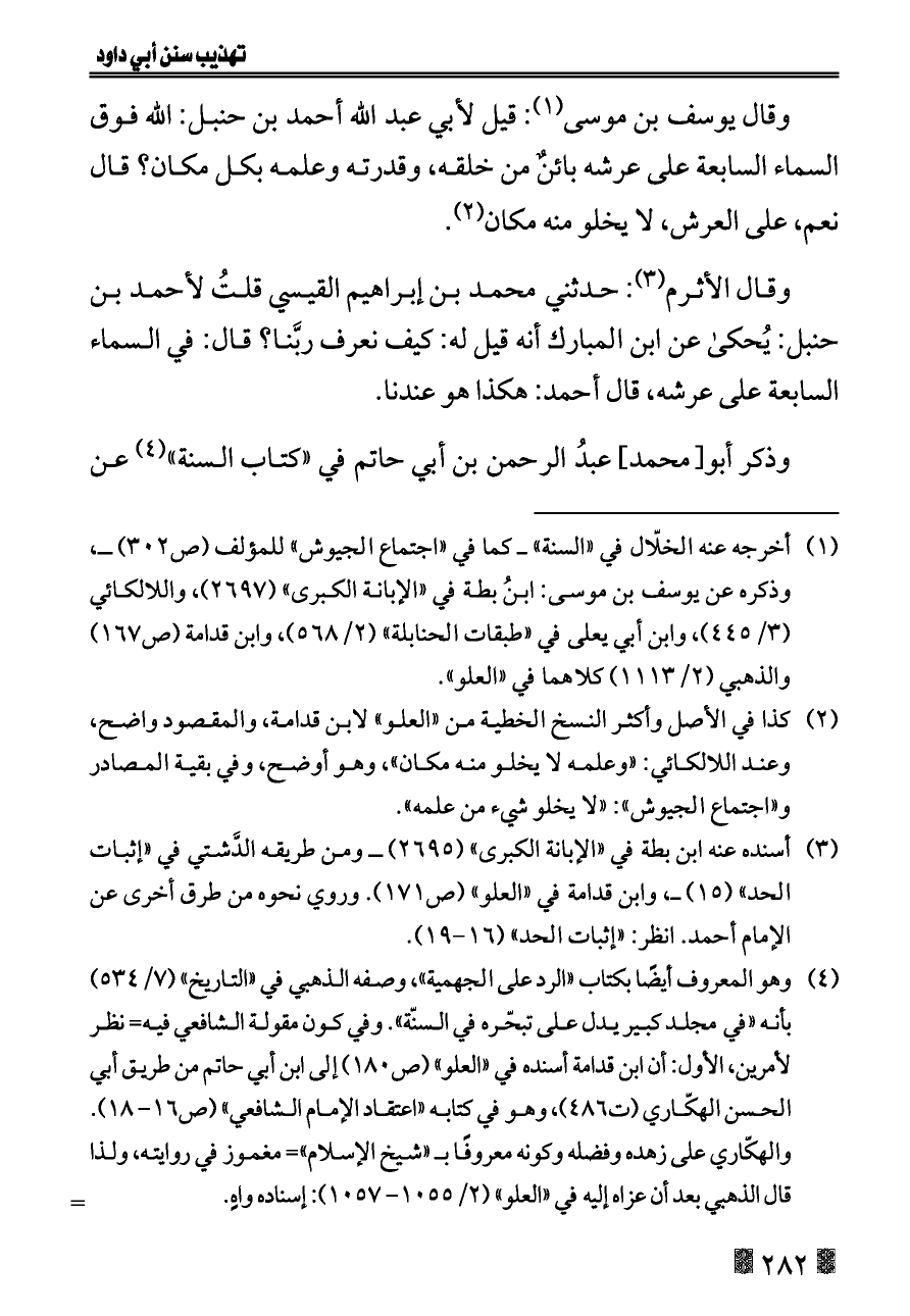 (¬١) أخرجه عنه الخلّال في «السنة» ــ كما في «اجتماع الجيوش» للمؤلف (ص ٣٠٢) ــ، وذكره عن يوسف بن موسى: ابنُ بطة في «الإبانة الكبرى» (٢٦٩٧)، واللالكائي (٣/ ٤٤٥)، وابن أبي يعلى في «طبقات الحنابلة» (٢/ ٥٦٨)، وابن قدامة (ص ١٦٧) والذهبي (٢/ ١١١٣) كلاهما في «العلو».