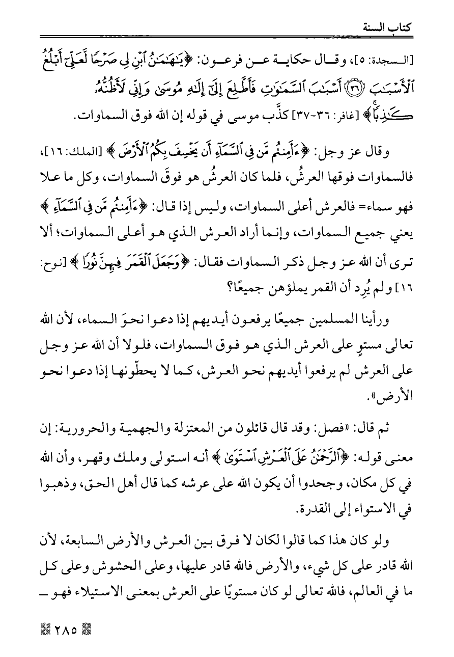 وقال عز وجل: {أَأَمِنْتُمْ مَنْ فِي السَّمَاءِ أَنْ يَخْسِفَ بِكُمُ الْأَرْضَ} [الملك: ١٦]، فالسماوات فوقها العرشُ، فلما كان العرشُ هو فوقَ السماوات، وكل ما علا فهو سماء= فالعرش أعلى السماوات، وليس إذا قال: {أَأَمِنْتُمْ مَنْ فِي السَّمَاءِ} يعني جميع السماوات، وإنما أراد العرش الذي هو أعلى السماوات؛ ألا ترى أن الله عز وجل ذكر السماوات فقال: {وَجَعَلَ الْقَمَرَ فِيهِنَّ نُورًا} [نوح: ١٦] ولم يُرِد أن القمر يملؤهن جميعًا؟