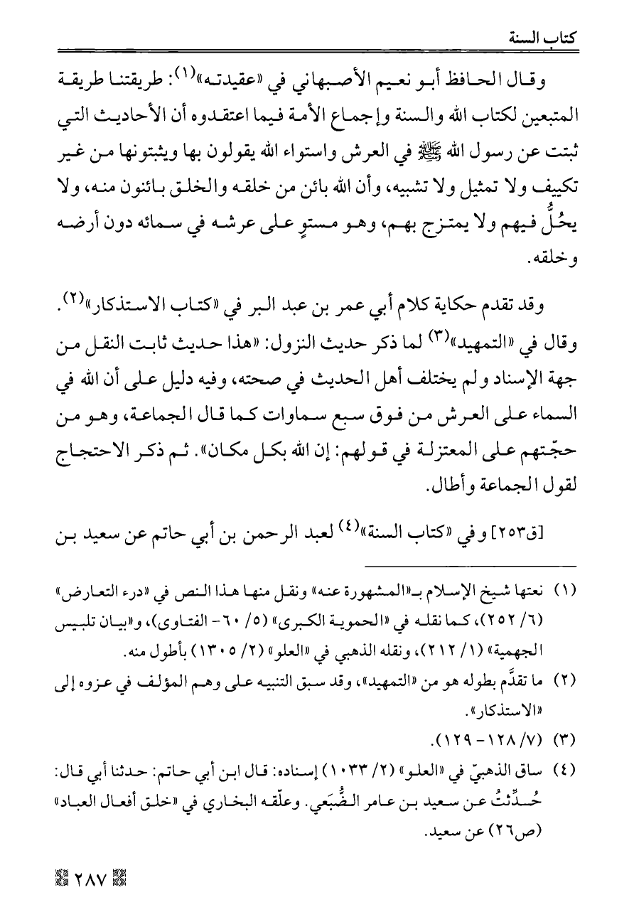 وقد تقدم حكاية كلام أبي عمر بن عبد البر في «كتاب الاستذكار» (¬٢). وقال في «التمهيد» (¬٣) لما ذكر حديث النزول: «هذا حديث ثابت النقل من جهة الإسناد ولم يختلف أهل الحديث في صحته، وفيه دليل على أن الله في السماء على العرش من فوق سبع سماوات كما قال الجماعة، وهو من حجّتهم على المعتزلة في قولهم: إن الله بكل مكان». ثم ذكر الاحتجاج لقول الجماعة وأطال.