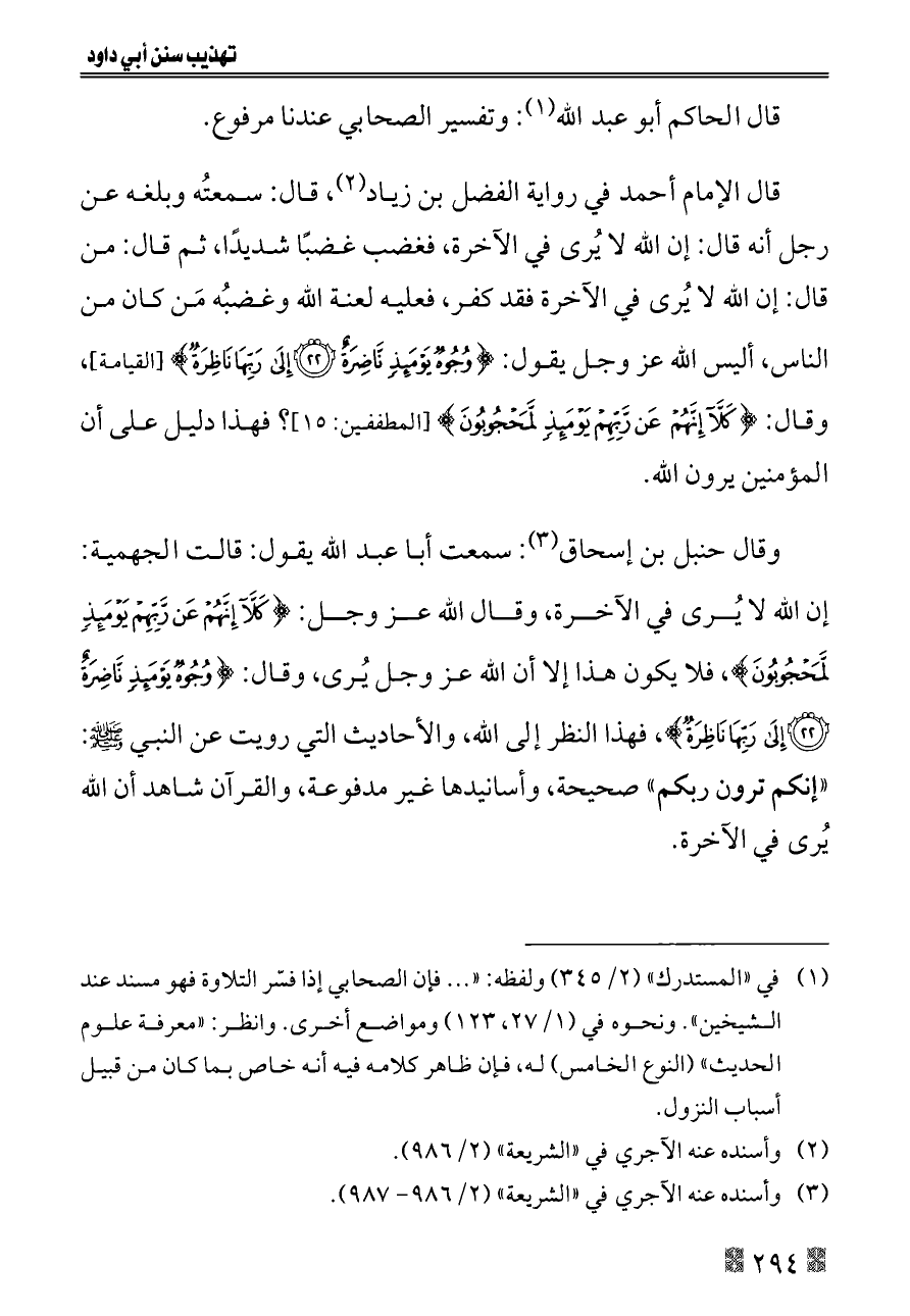 وقال حنبل بن إسحاق (¬٣): سمعت أبا عبد الله يقول: قالت الجهمية: إن الله لا يُرى في الآخرة، وقال الله عز وجل: {كَلَّا إِنَّهُمْ عَنْ رَبِّهِمْ يَوْمَئِذٍ لَمَحْجُوبُونَ}، فلا يكون هذا إلا أن الله عز وجل يُرى، وقال: {وُجُوهٌ يَوْمَئِذٍ نَاضِرَةٌ (٢٢) إِلَى رَبِّهَا نَاظِرَةٌ}، فهذا النظر إلى الله، والأحاديث التي رويت عن النبي - صلى الله عليه وسلم -: «إنكم ترون ربكم» صحيحة، وأسانيدها غير مدفوعة، والقرآن شاهد أن الله يُرى في الآخرة.