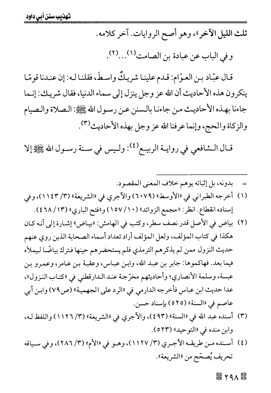 (¬٢) بياض في الأصل قدر نصف سطر، وكتب في الهامش: «بياض» إشارة إلى أنه كان هكذا في كتاب المؤلف، ولعل المؤلف أراد تعداد أسماء الصحابة الذين روي عنهم حديث النزول ممن لم يذكرهم الترمذي فلم يستحضرهم حينها فترك بياضًا ليملأه فيما بعد. فهاكموها: جابر بن عبد الله، وابن عباس، وعقبة بن عامر، وعمرو بن عبسة، وسلمة الأنصاري؛ وأحاديثهم مخرّجة عند الدارقطني في «كتاب النزول»، عدا حديث ابن عباس فأخرجه الدارمي في «الرد على الجهمية» (ص ٧٩) وابن أبي عاصم في «السنة» (٥٢٥) بإسناد حسن.