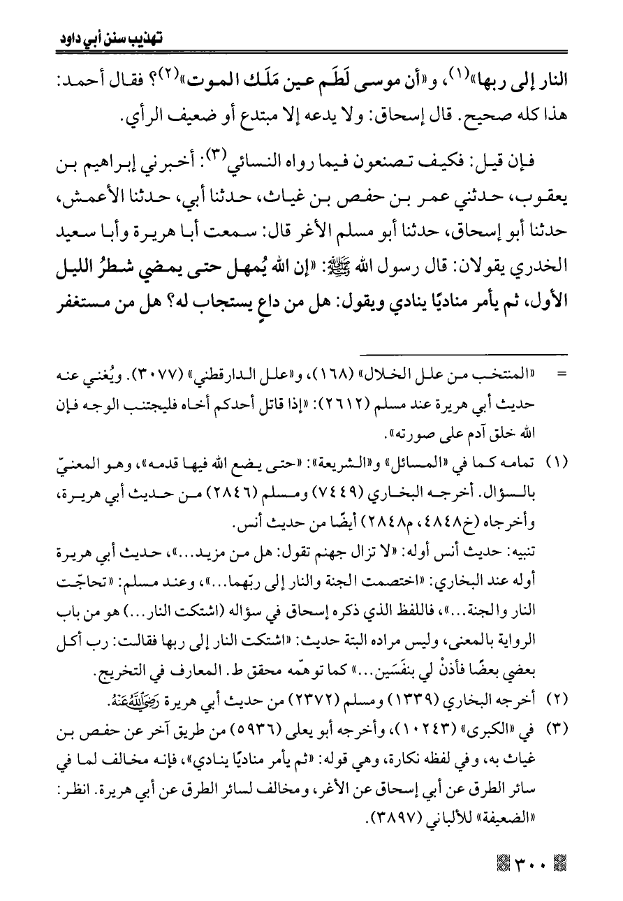 تنبيه: حديث أنس أوله: «لا تزال جهنم تقول: هل من مزيد ... »، حديث أبي هريرة أوله عند البخاري: «اختصمت الجنة والنار إلى ربّهما ... »، وعند مسلم: «تحاجّت النار والجنة ... »، فاللفظ الذي ذكره إسحاق في سؤاله (اشتكت النار ... ) هو من باب الرواية بالمعنى، وليس مراده البتة حديث: «اشتكت النار إلى ربها فقالت: رب أكل بعضي بعضًا فأذنْ لي بنفَسَين ... » كما توهّمه محقق ط. المعارف في التخريج.