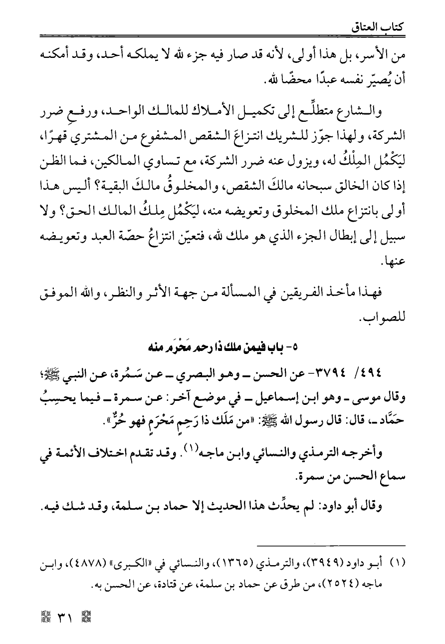 ٤٩٤/ ٣٧٩٤ - عن الحسن ــ وهو البصري ــ عن سَمُرة، عن النبي - صلى الله عليه وسلم -؛ وقال موسى ــ وهو ابن إسماعيل ــ في موضع آخر: عن سمرة ــ فيما يحسِبُ حَمَّاد ــ، قال: قال رسول الله - صلى الله عليه وسلم -: «من مَلَك ذا رَحِمٍ مَحْرَمٍ فهو حُرٌّ».