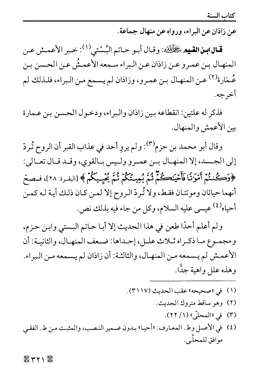 قال ابن القيم - رحمه الله -: وقال أبو حاتم البُسْتي (¬١): خبر الأعمش عن المنهال بن عمرو عن زاذان عن البراء سمعه الأعمشُ عن الحسن بن عُمَارة (¬٢) عن المنهال بن عمرو، وزاذان لم يسمع من البراء، فلذلك لم أخرجه.