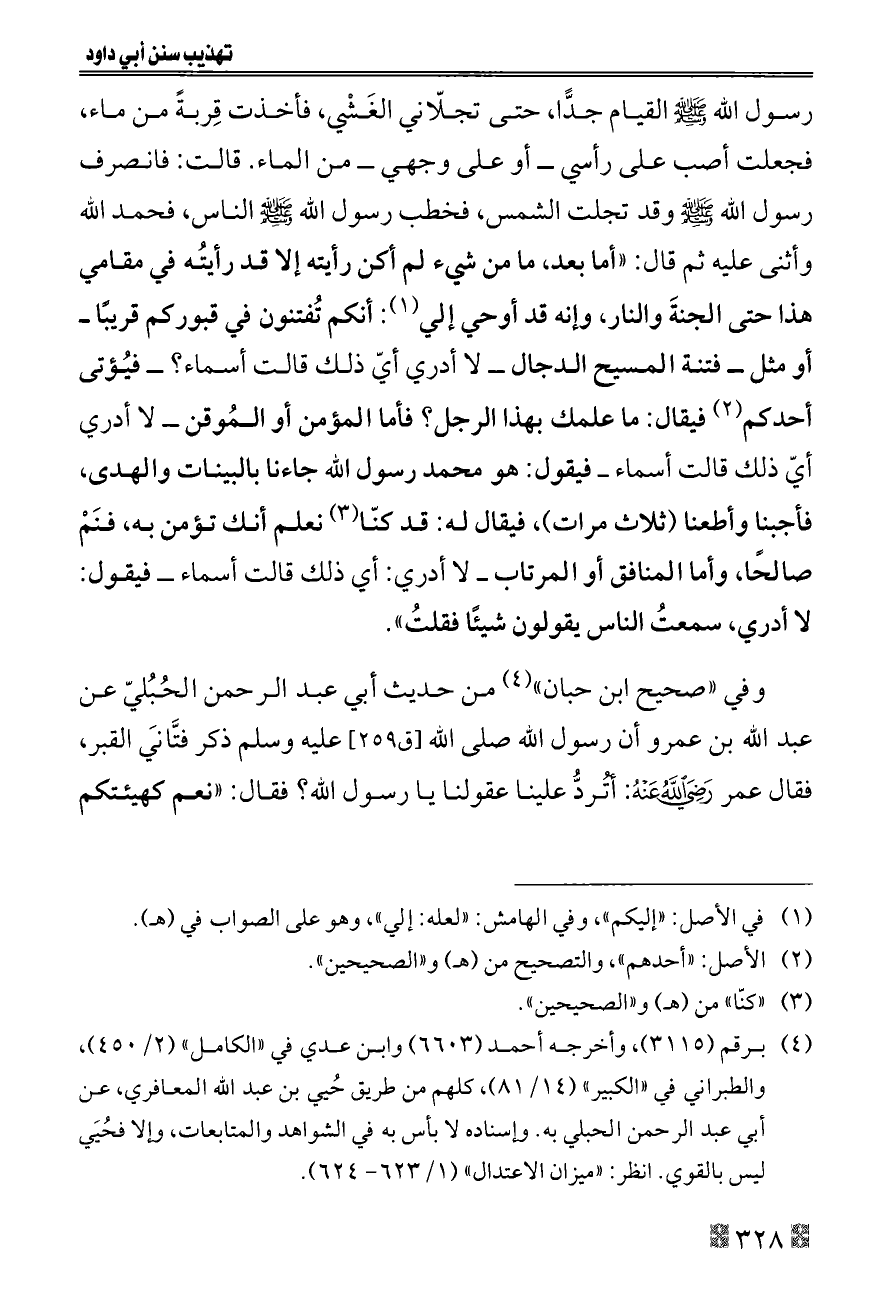 وفي «صحيح ابن حبان» (¬٤) من حديث أبي عبد الرحمن الحُبُليّ عن عبد الله بن عمرو أن رسول الله صلى الله [ق ٢٥٩] عليه وسلم ذكر فتَّانَي القبر، فقال عمر - رضي الله عنه -: أتُردُّ علينا عقولنا يا رسول الله؟ فقال: «نعم كهيئتكم