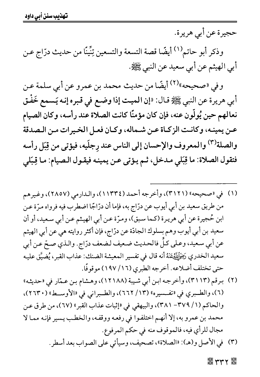 (¬١) في «صحيحه» (٣١٢١)، وأخرجه أحمد (١١٣٣٤)، والدارمي (٢٨٥٧)، وغيرهم من طريق سعيد بن أبي أيوب عن درّاج به، فإما أن درّاجًا اضطرب فيه فرواه مرّة عن ابن حُجيرة عن أبي هريرة (كما سبق)، ومرّة عن أبي الهيثم عن أبي سعيد، أو أن سعيد بن أبي أيوب وهم بسلوك الجادّة عن درّاج، فإن أكثر روايته هي عن أبي الهيثم عن أبي سعيد، وعلى كلٍّ فالحديث ضعيف لضعف درّاج. والذي صحّ عن أبي سعيد الخدري - رضي الله عنه - أنه قال في تفسير المعيشة الضنك: عذاب القبر، يُضيَّق عليه حتى تختلف أضلاعه. أخرجه الطبري (١٦/ ١٩٧) موقوفًا.