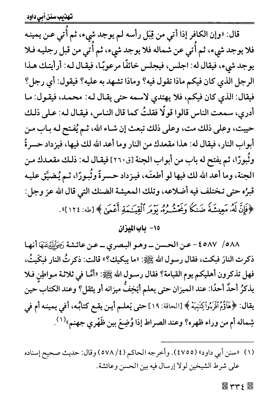 ٥٨٨/ ٤٥٨٧ - عن الحسن ــ وهو البصري ــ عن عائشة - رضي الله عنها - أنها ذكرت النارَ فبكت، فقال رسول الله - صلى الله عليه وسلم -: «ما يبكيك؟» قالت: ذكرتُ النار فبكَيتُ، فهل تذكرون أهليكم يوم القيامة؟ فقال رسول الله - صلى الله عليه وسلم -: «أمَّا في ثلاثة مواطِنٍ فلا يذكرُ أحدٌ أحدًا: عند الميزان حتى يعلم أيَخِفُّ ميزانه أو يثقل؟ وعند الكتاب حين يقال: {هَاؤُمُ اقْرَءُوا كِتَابِيَهْ} [الحاقة: ١٩] حتى يَعلم أين يقع كتابُه، أفي يمينه أم في شِماله أم من وراء ظهره؟ وعند الصراط إذا وُضِعَ بين ظَهْري جهنم» (¬١).