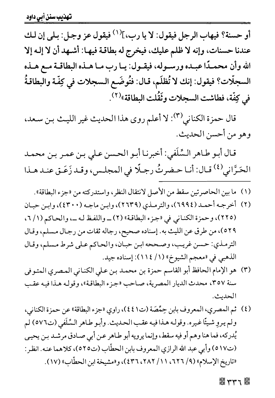 (¬٣) هو الإمام الحافظ أبو القاسم حمزة بن محمد بن علي الكناني المصري المتوفى سنة ٣٥٧، محدث الديار المصرية، صاحب «جزء البطاقة»، وقوله هذا فيه عقب الحديث.