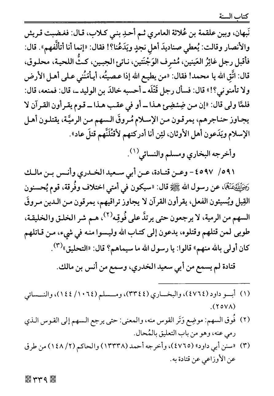 ٥٩١/ ٤٥٩٧ - وعن قتادة، عن أبي سعيد الخدري وأنس بن مالك - رضي الله عنهما -، عن رسول الله - صلى الله عليه وسلم - قال: «سيكون في أمتي اختلاف وفُرقة، قوم يُحسنون القِيل ويُسيئون الفعل، يقرأون القرآن لا يجاوز تراقيهم، يمرقون من الدين مروقَ السهم من الرمية، لا يرجعون حتى يرتدَّ على فُوقِه (¬٢)، هم شر الخلق والخليقة، طوبى لمن قتلهم وقتلوه، يدعون إلى كتاب الله وليسوا منه في شيء، من قاتلهم كان أولى بالله منهم» قالوا: يا رسول الله ما سيماهم؟ قال: «التحليق» (¬٣).
