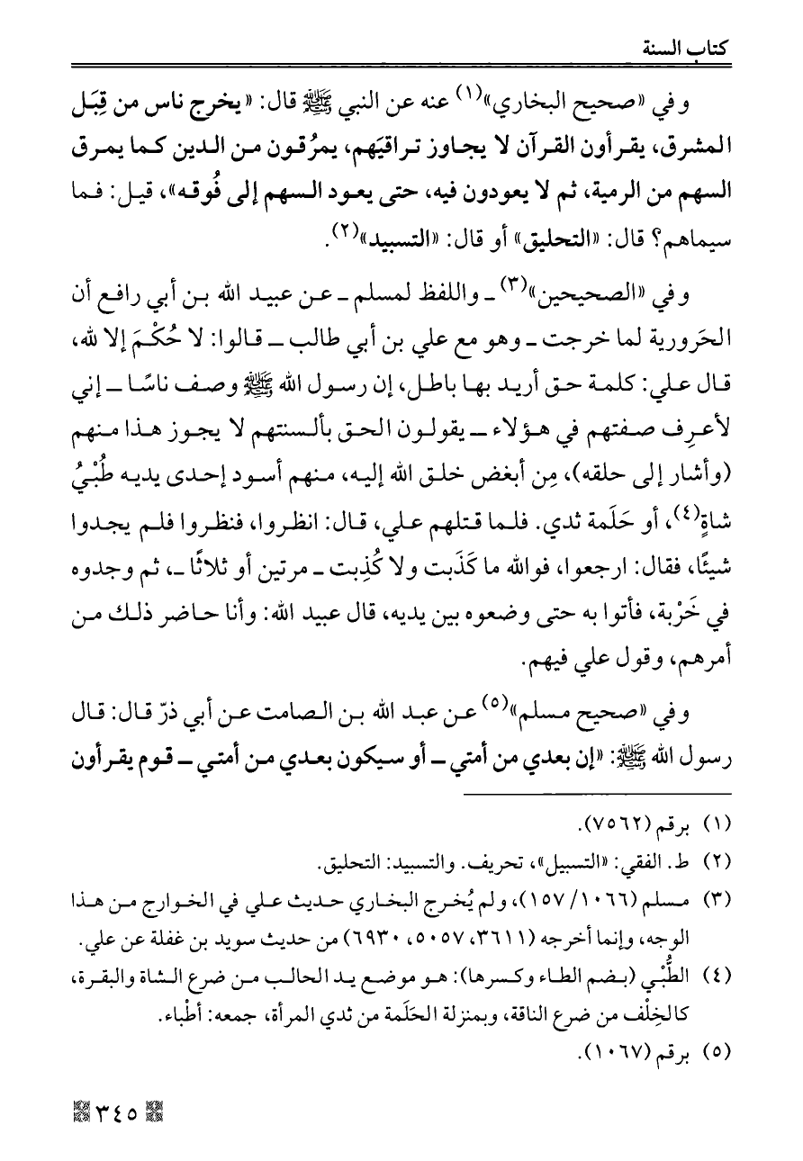 وفي «الصحيحين» (¬٣) ــ واللفظ لمسلم ــ عن عبيد الله بن أبي رافع أن الحَرورية لما خرجت ــ وهو مع علي بن أبي طالب ــ قالوا: لا حُكْمَ إلا لله، قال علي: كلمة حق أريد بها باطل، إن رسول الله - صلى الله عليه وسلم - وصف ناسًا ــ إني لأعرِف صفتهم في هؤلاء ــ يقولون الحق بألسنتهم لا يجوز هذا منهم (وأشار إلى حلقه)، مِن أبغض خلق الله إليه، منهم أسود إحدى يديه طُبْيُ شاةٍ (¬٤)، أو حَلَمة ثدي. فلما قتلهم علي، قال: انظروا، فنظروا فلم يجدوا شيئًا، فقال: ارجعوا، فوالله ما كَذَبت ولا كُذِبت ــ مرتين أو ثلاثًا ــ، ثم وجدوه في خَرْبة، فأتوا به حتى وضعوه بين يديه، قال عبيد الله: وأنا حاضر ذلك من أمرهم، وقول علي فيهم.