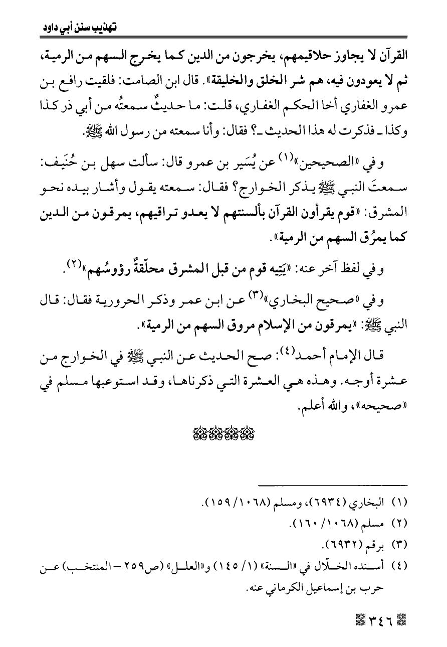 وفي «صحيح البخاري» (¬٣) عن ابن عمر وذكر الحرورية فقال: قال النبي - صلى الله عليه وسلم -: «يمرقون من الإسلام مروق السهم من الرمية».