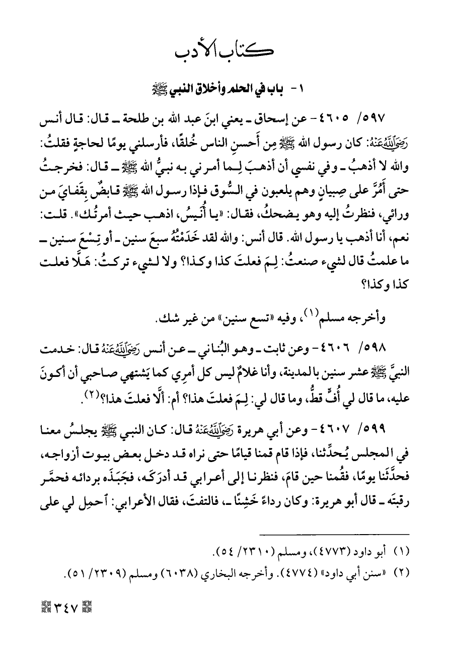 ٥٩٧/ ٤٦٠٥ - عن إسحاق ــ يعني ابنَ عبد الله بن طلحة ــ قال: قال أنس - رضي الله عنه -: كان رسول الله - صلى الله عليه وسلم - مِن أَحسنِ الناس خُلقًا، فأرسلني يومًا لحاجةٍ فقلتُ: والله لا أذهبُ ــ وفي نفسي أن أذهبَ لِما أمرني به نبيُّ الله - صلى الله عليه وسلم - ــ قال: فخرجتُ حتى أَمُرَّ على صِبيانٍ وهم يلعبون في السُّوق فإذا رسول الله - صلى الله عليه وسلم - قابضٌ بِقَفايَ من ورائي، فنظرتُ إليه وهو يضحكُ، فقال: «يا أُنَيسُ، اذهب حيث أمرتُك». قلت: نعم، أنا أذهب يا رسول الله. قال أنس: والله لقد خَدَمْتُهُ سبعَ سنين ــ أو تِسْعَ سنين ــ ما علمتُ قال لشيء صنعتُ: لِمَ فعلتَ كذا وكذا؟ ولا لشيء تركتُ: هَلَّا فعلت كذا وكذا؟