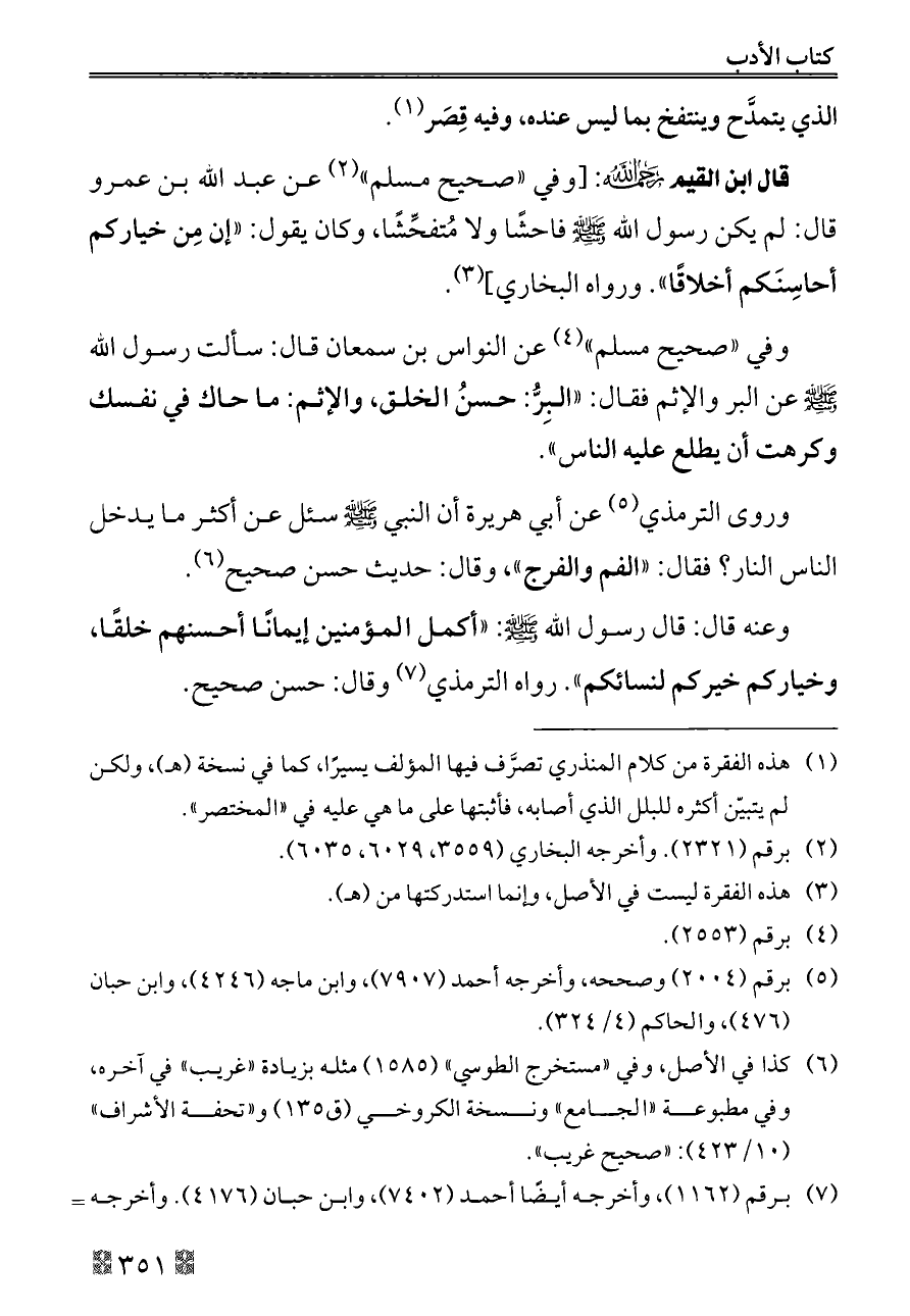 قال ابن القيم - رحمه الله -: [وفي «صحيح مسلم» (¬٢) عن عبد الله بن عمرو قال: لم يكن رسول الله - صلى الله عليه وسلم - فاحشًا ولا مُتفحِّشًا، وكان يقول: «إن مِن خياركم أحاسِنَكم أخلاقًا». ورواه البخاري] (¬٣).