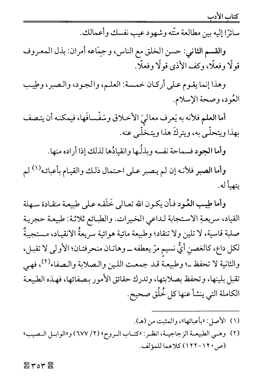 وأما طِيب العُود فأن يكون الله تعالى خَلَقه على طبيعة منقادة سهلة القياد، سريعةِ الاستجابة لداعي الخيرات. والطبائع ثلاثة: طبيعة حجرية صلبة قاسية، لا تلين ولا تنقاد؛ وطبيعة مائية هوائية سريعةُ الانقياد، مستجيبةٌ لكل داع، كالغصنِ أيُّ نسيمٍ مرّ يعطفه ــ وهاتان منحرفتان؛ الأولى لا تقبل، والثانية لا تحفظ ــ؛ وطبيعة قد جمعت اللين والصلابة والصفاء (¬٢)، فهي تقبل بلينها، وتحفظ بصلابتها، وتدرك حقائق الأمور بصفائها، فهذه الطبيعة الكاملة التي ينشأ عنها كل خُلُق صحيح.