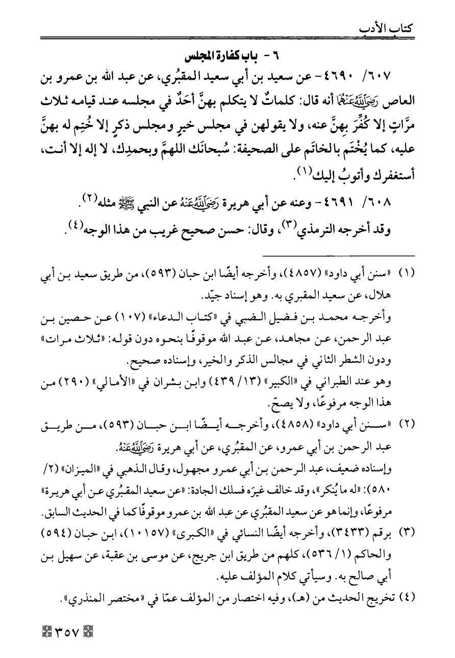٦٠٧/ ٤٦٩٠ - عن سعيد بن أبي سعيد المقبُري، عن عبد الله بن عمرو بن العاص - رضي الله عنهما - أنه قال: كلماتٌ لا يتكلم بهنَّ أحَدٌ في مجلسه عند قيامه ثلاث مرَّاتٍ إلا كُفِّرَ بِهنَّ عنه، ولا يقولهن في مجلس خيرٍ ومجلس ذكرٍ إلا خُتِم له بهنَّ عليه، كما يُخْتَم بالخاتَم على الصحيفة: سُبحانَك اللهمَّ وبحمدِك، لا إله إلا أنت، أستغفرك وأتوبُ إليك (¬١).