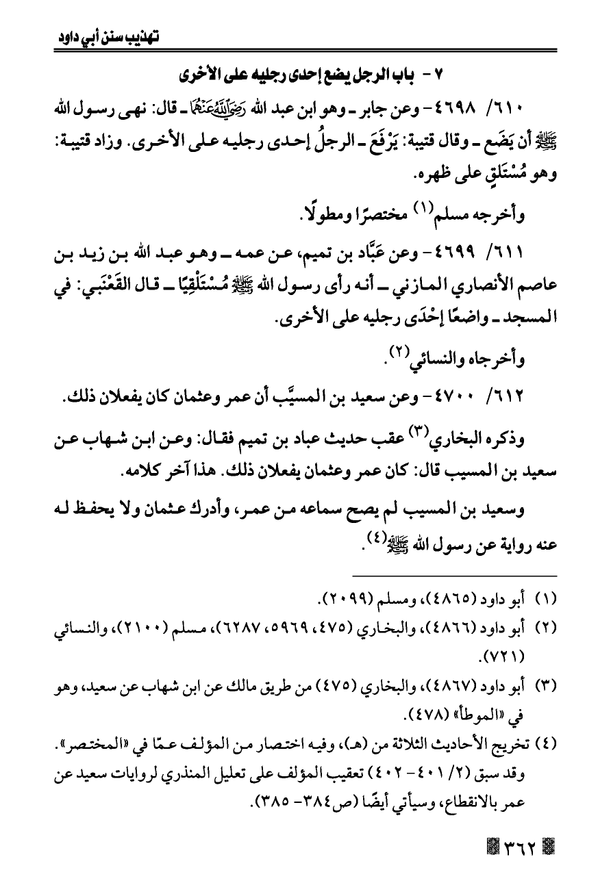 ٦١١/ ٤٦٩٩ - وعن عَبَّاد بن تميم، عن عمه ــ وهو عبد الله بن زيد بن عاصم الأنصاري المازني ــ أنه رأى رسول الله - صلى الله عليه وسلم - مُسْتَلْقِيًا ــ قال القَعْنَبي: في المسجد ــ واضعًا إحْدَى رجليه على الأخرى.