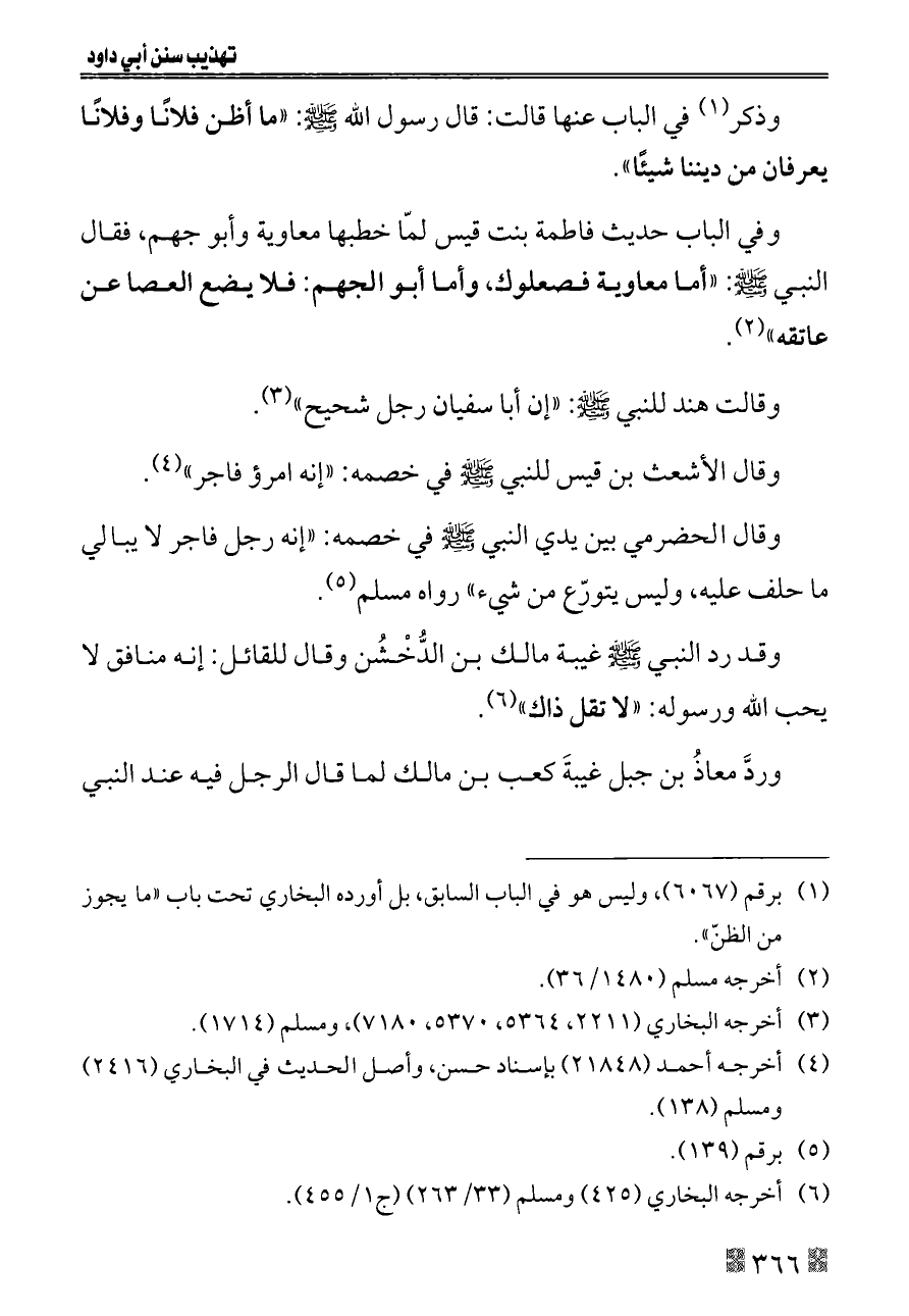 وفي الباب حديث فاطمة بنت قيس لمّا خطبها معاوية وأبو جهم، فقال النبي - صلى الله عليه وسلم -: «أما معاوية فصعلوك، وأما أبو الجهم: فلا يضع العصا عن عاتقه» (¬٢).