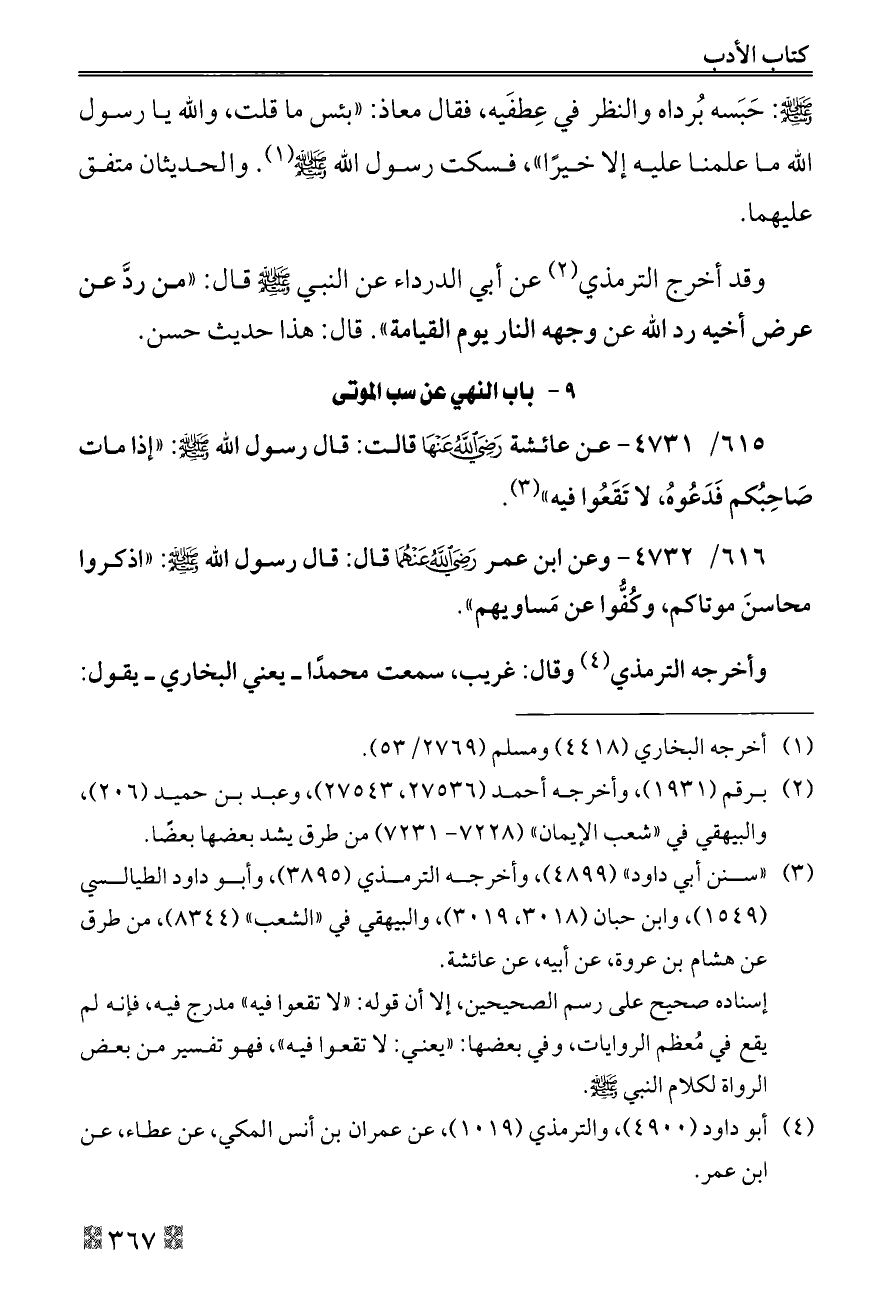٦١٥/ ٤٧٣١ - عن عائشة - رضي الله عنها - قالت: قال رسول الله - صلى الله عليه وسلم -: «إذا مات صَاحِبُكم فَدَعُوهُ، لا تَقَعُوا فيه» (¬٣).