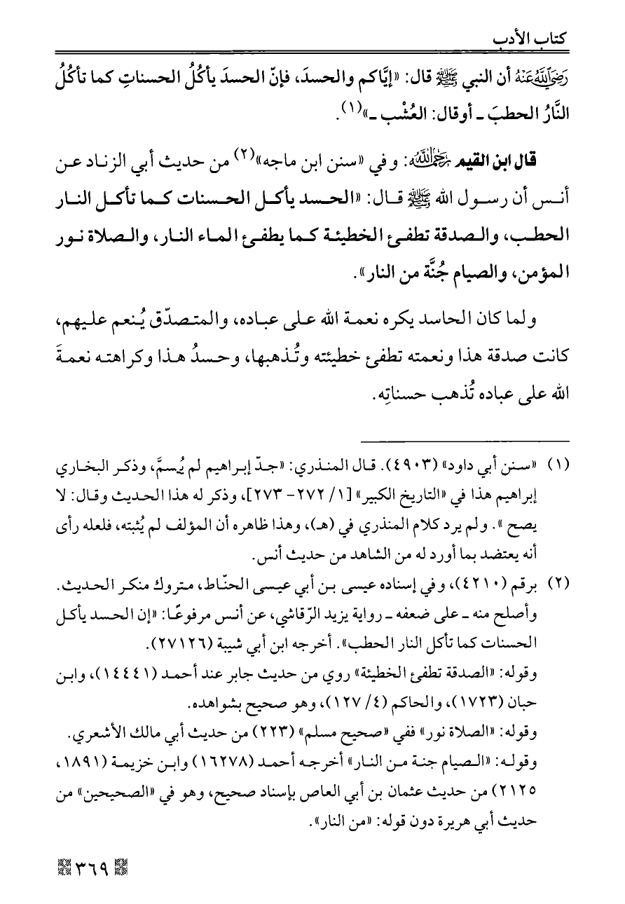 قال ابن القيم - رحمه الله -: وفي «سنن ابن ماجه» (¬٢) من حديث أبي الزناد عن أنس أن رسول الله - صلى الله عليه وسلم - قال: «الحسد يأكل الحسنات كما تأكل النار الحطب، والصدقة تطفئ الخطيئة كما يطفئ الماء النار، والصلاة نور المؤمن، والصيام جُنَّة من النار».